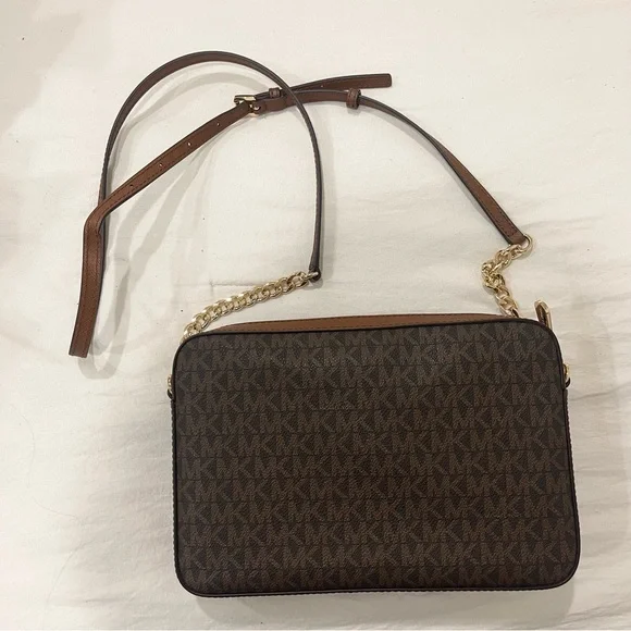 Gorgeous Michael Kors logo crossbody bag. Gifted to me, but I have too many bags. I only used it once and has been hanging in my closet, I would love for it to find a new home. Tags are inside the bag but not attached. Because it’s been hanging the strap is a little bent but not damaged. Please see photos. Send me your best offer!