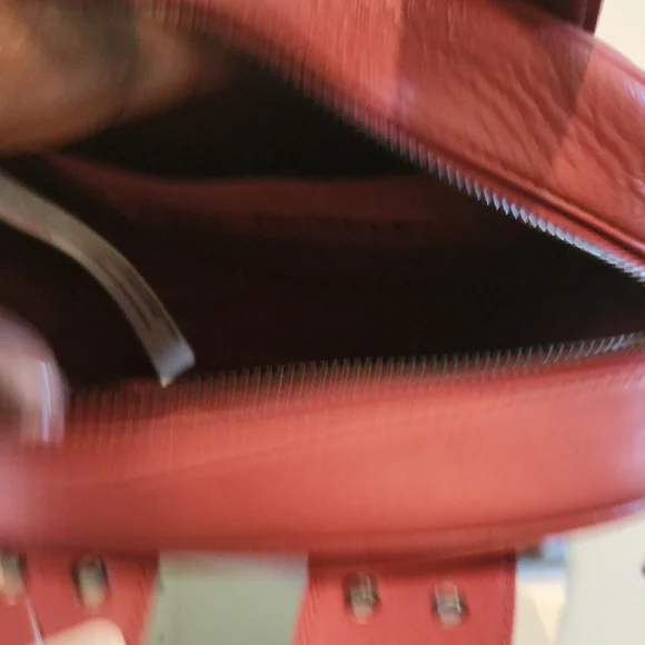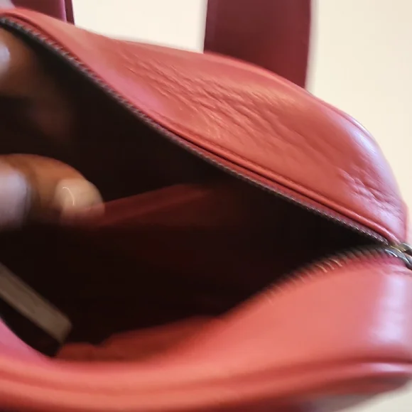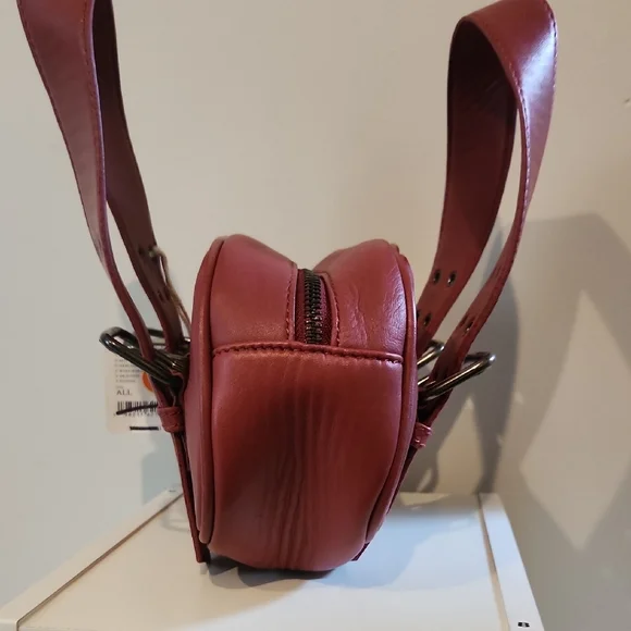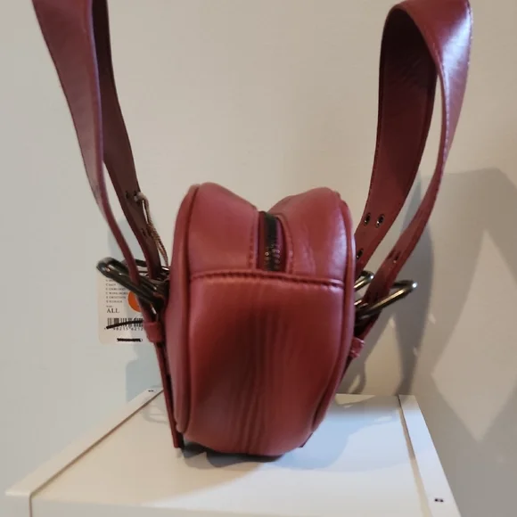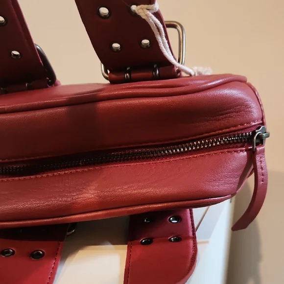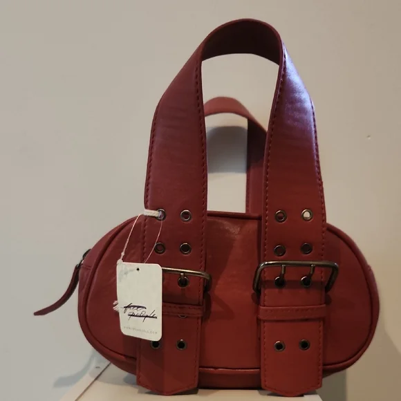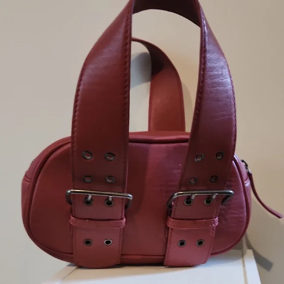 Chic mini bag with bold red color. Features sturdy handles and buckle accents. Ideal for stylish outings.