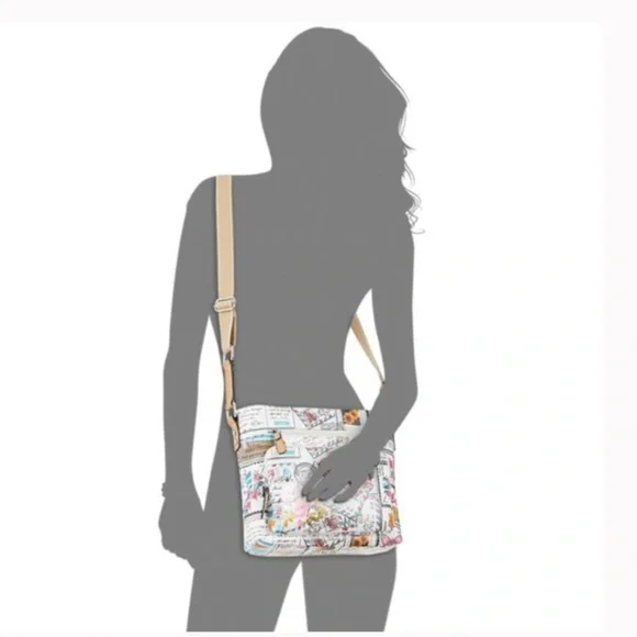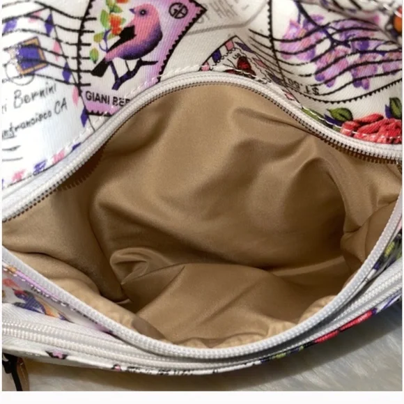 20 bin 5Now this beautiful and fun bag is something to write home about!Meet the fun and whimsical Giani Bernini Canvas Potcard Small Crossbody Bag.Measurements: 12”width, 911”Height, 5”DepthSilhouette is based on a 5’9” ModelSilver tone with one pocket in front zipper pocket, two interior zipper pockets, one cellphone pocketOne interior zipper pocket,Large enough to fit an IPadFaux leather, vegan , love and protect animals