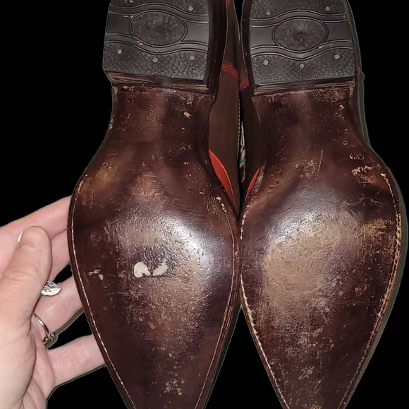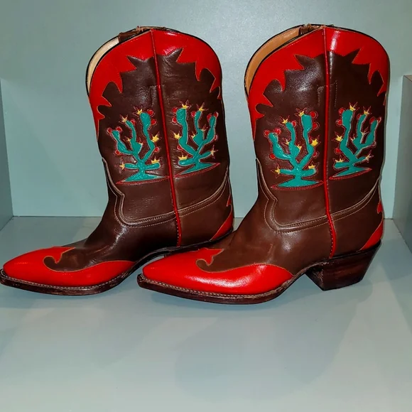 These vintage cowboy boots have many eye-catching details. The most prominent feature is the beautifully rendered Saguaro cactus embroidery on the shaft of each boot. This instantly gives them a strong Southwestern vibe.The overall silhouette is consistent with classic Western boot design, featuring a pointed toe, a moderately high Cuban heel, and a traditional shaft height. A subtle yet stylish detail is the scalloped design at the top of the boot shaft. This boot was released in 1993, the first year of production, stamped in inner sole; Rocketbuster is a renowned custom boot maker known for their artistic and often flamboyant designs. Please note-Left boot: size 6 Right boot: 5½#vintagcowboyboots #Rocketbuster #customboots #country #boots #Southwestern #cactus
