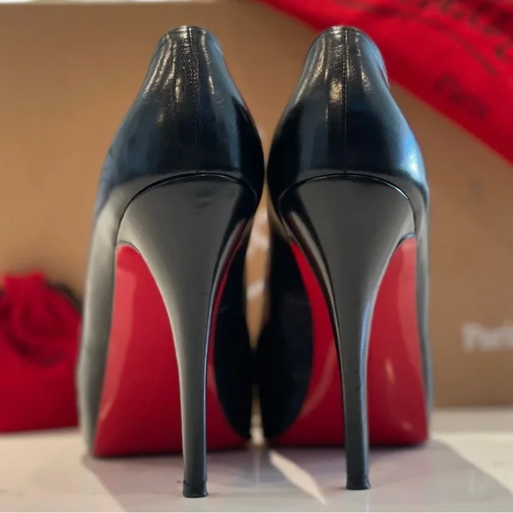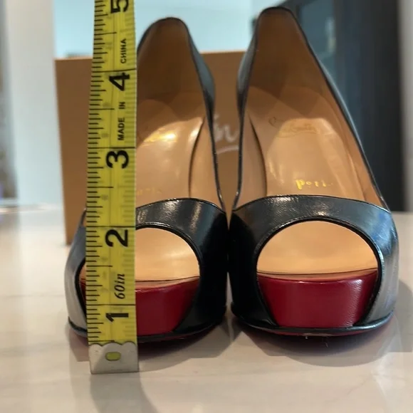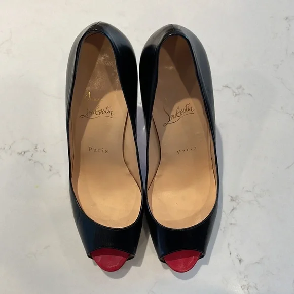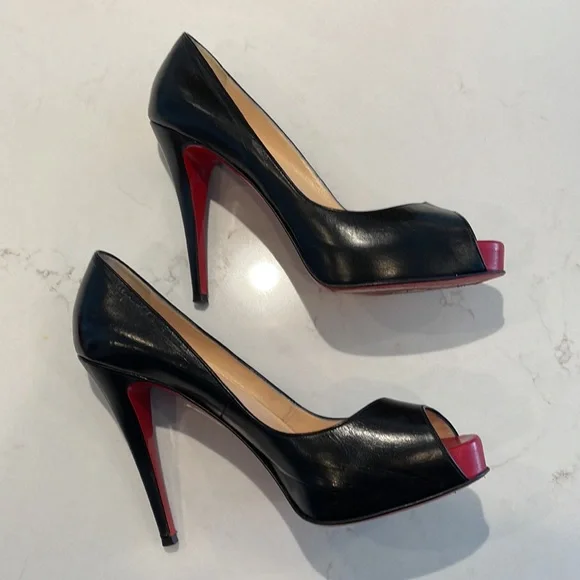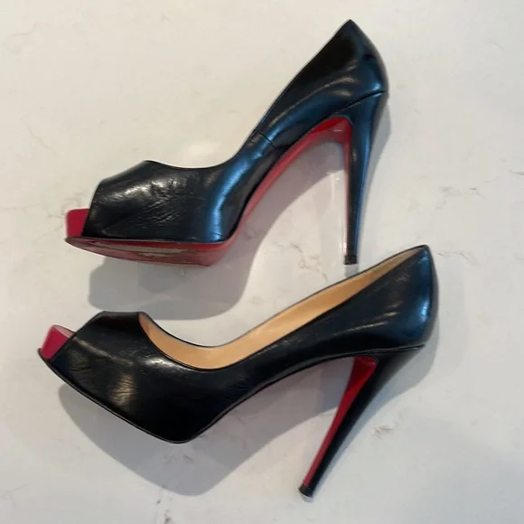 Christian Louboutin Very Prive 120 open toe pump in black leather with a pop of red at the front toe bed. Show off your pedicure with the open toe and leave jaws dropping behind you with the classic red bottom.These are previously owned and gently used. Only worn 1-2 times. Main areas that show these are pre-owned are minor wear in the foot bed and of course unavoidable is the wear at the bottom of the red soles - see pictures showing each.Includes original box, dust bag, and extra heel taps. These were purchased at Neiman Marcus. Keep in mind Christian Louboutin runs small.I typically wear size US 8.Websites suggest going up one size from your normal US size.
