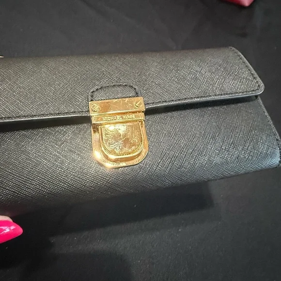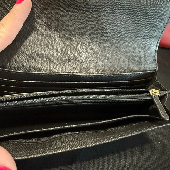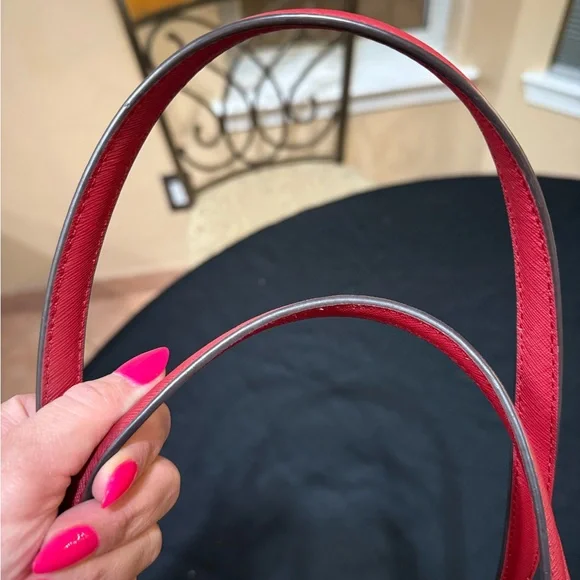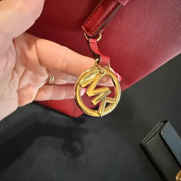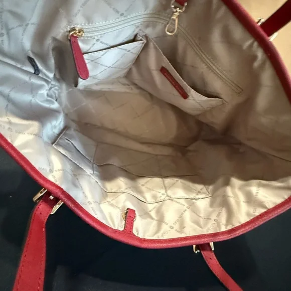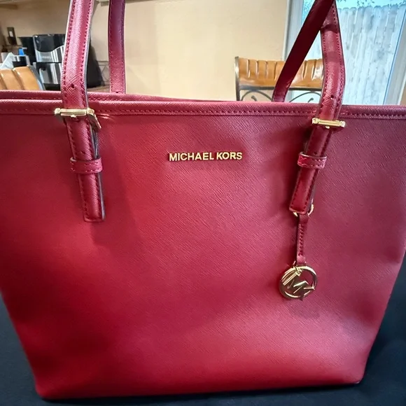 Red Jet Set tote with saffiano leather and gold tone hardware. No stains inside or on the leather. The wallet has no stains inside or on the leather. There’s a few scratches where it latches (see photos). Comes with black dust bag.