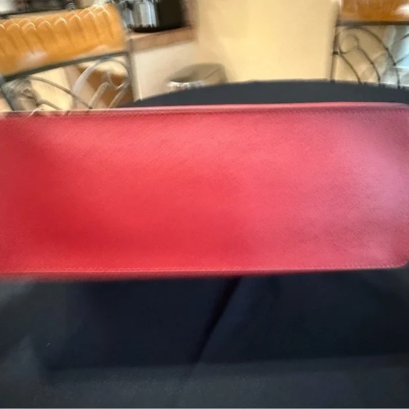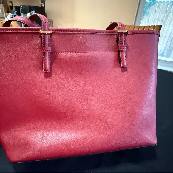 Red Jet Set tote with saffiano leather and gold tone hardware. No stains inside or on the leather. The wallet has no stains inside or on the leather. There’s a few scratches...