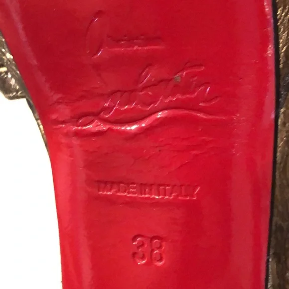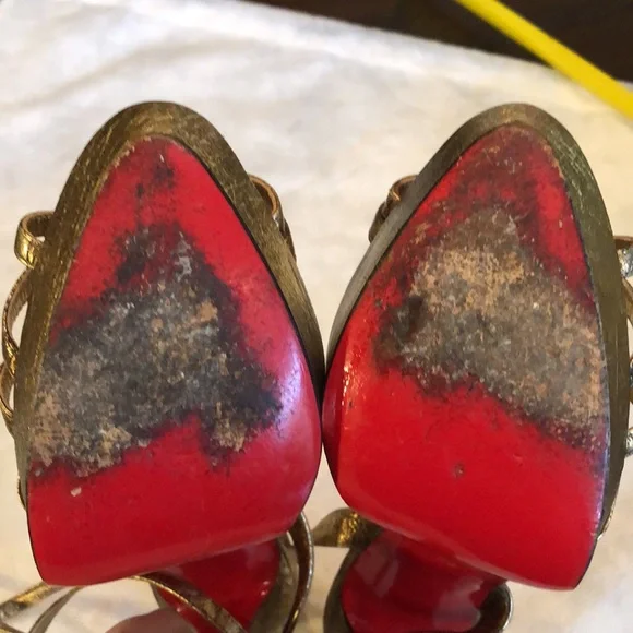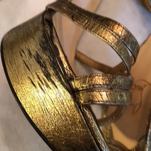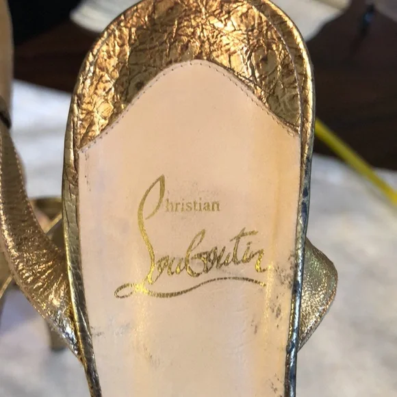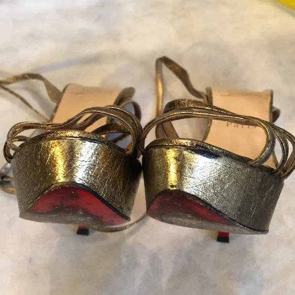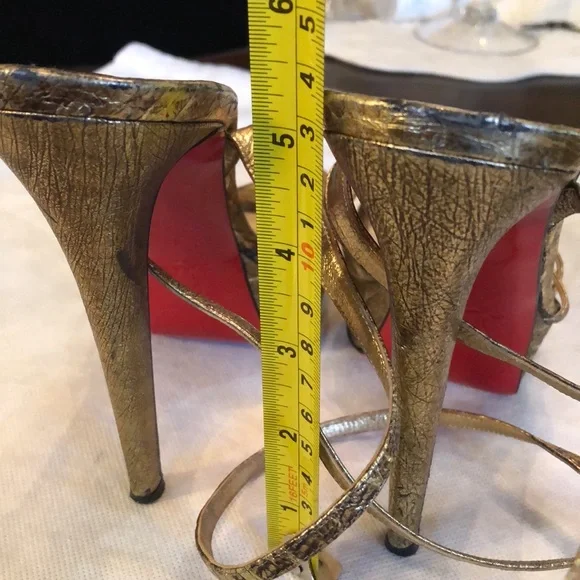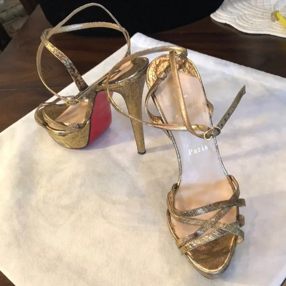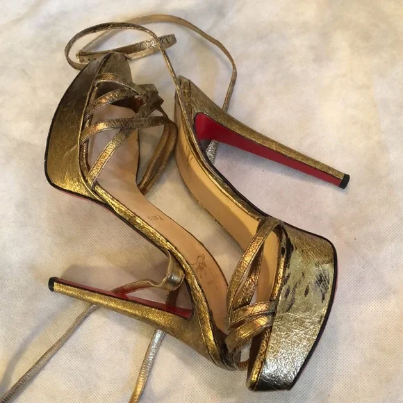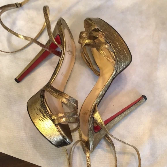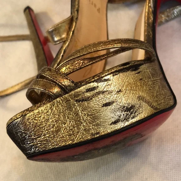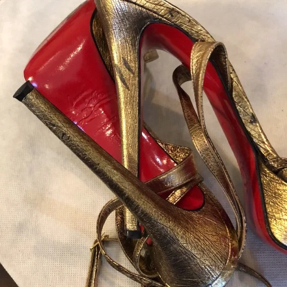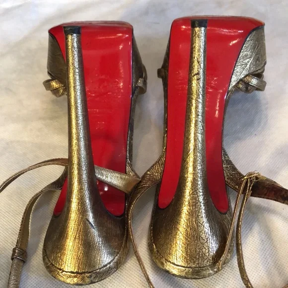 Christian Louboutin Gold metallic leather strappy buckle classic red sole Heels