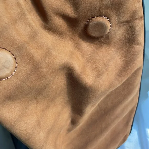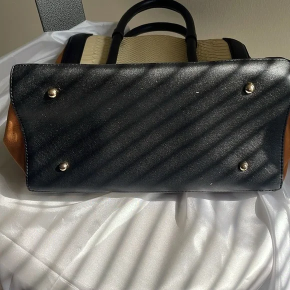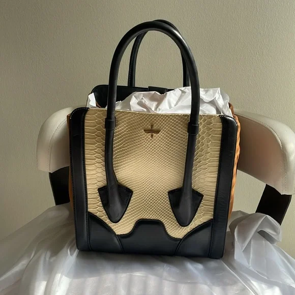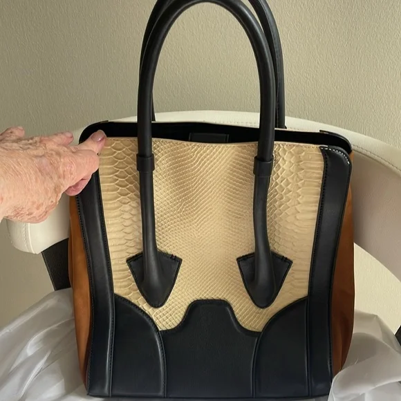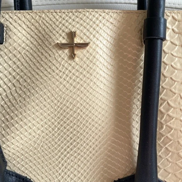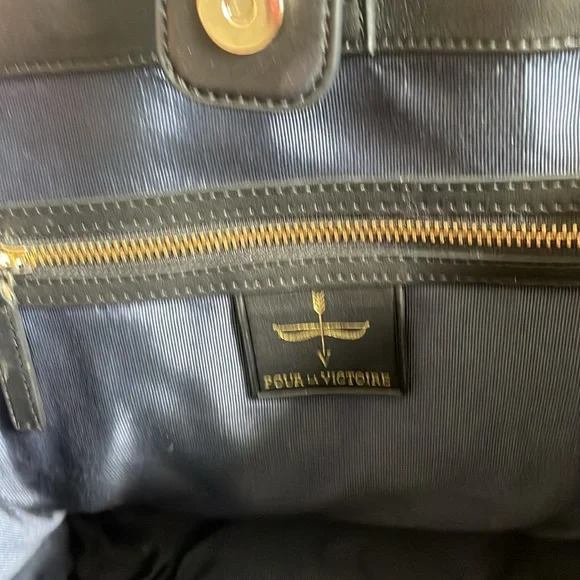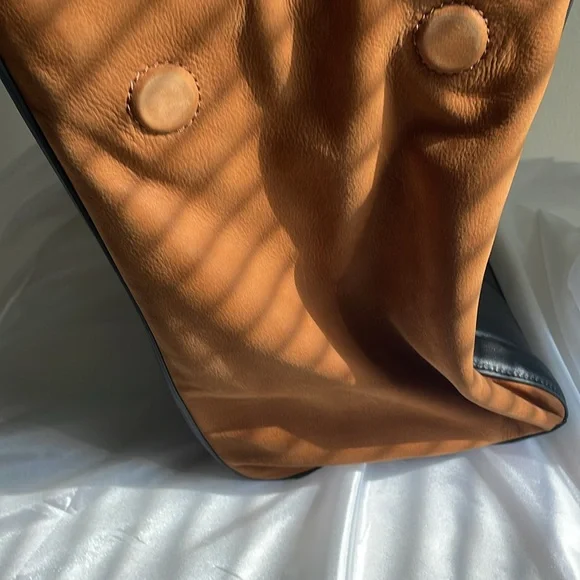 Pour la Victoire Large Butler Bag Black and Cream With Brown Suede 6” side panelswith hidden magnetic closures, beautifully made in excellent preowned approximately...