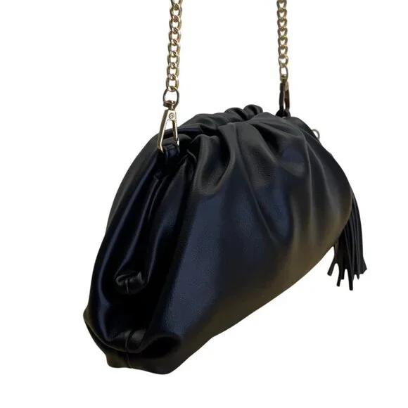 Understated Leather Women’s Black Leather With Tassel Detail & Gold Chain Clutch