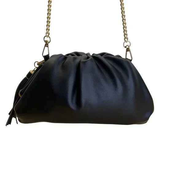 Stylish and versatile, this black leather shoulder bag adds elegance to outfits. Features a gold chain strap and tassel detail for a chic touch.• Drawstring-style ruched...