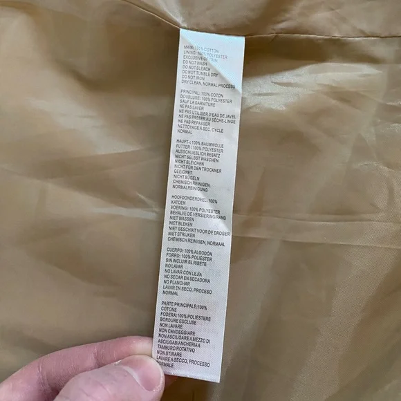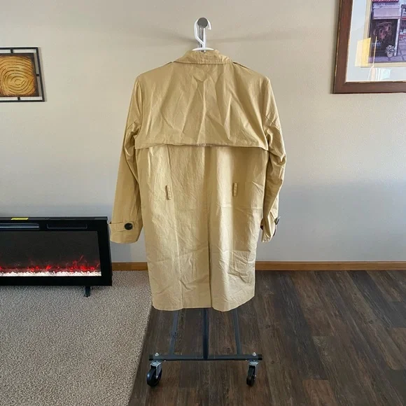 • 2019 boohooMAN Trench Coat• Black branding print lettering on right chest, left arm, & left bottom• Beige / Honey main colorway• Shiny beige / honey inside lining color• 2 front slit pockets• Black & tan effect buttons for enclosure and / or styling throughout coat• Collar, back flap, wrist & shoulder straps, waist belt loops, and a fish tail style back for additional styling.• This coat looks great styled with Burberry’s iconic nova check print, etc.!• 100% cotton outer material ; 100% polyester inside lining• U.S. Men’s M (Medium)• Great Condition! Rare piece!• Dimensions:– 38” length– 24” sleeves– 19” shoulders– 21.25” chest– 8” neck opening (when jacket is closed)– 22” hem