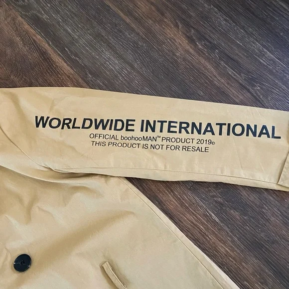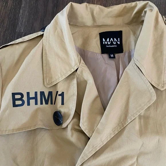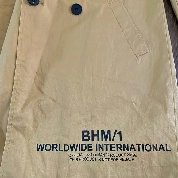• 2019 boohooMAN Trench Coat• Black branding print lettering on right chest, left arm, & left bottom• Beige / Honey main colorway• Shiny beige / honey inside lining...