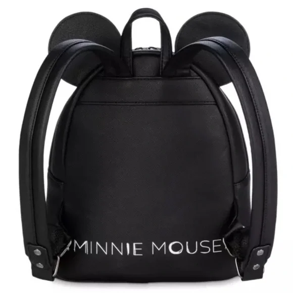 This stylish Loungefly backpack showcases a playful Minnie Mouse theme with black and white polka dots and a signature red bow. it combines fashion with a touch of Disney magic, making it a must-have accessory for fans.