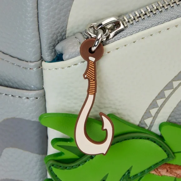 We’re hooked! Our Disney’s Moana Maui “Shark” Mini Backpack is the perfect way to pull off a fun, yet sharp look wherever you go. The domed, soft gray backpack takes on the form of Disney’s Maui when he accidentally shape-shifts into a shark. The front pocket for storing smaller items features an applique grass skirt with embroidery for the “twine.” Maui’s shark dorsal fin sticks up at the top, and he shows off a toothy grin. Debossed details add texture throughout, and on the side pockets, you’ll find stripes. A silicone zipper charm of the magical fishhook tops off the look. On the back, the words “You’re Welcome!” appear. Swim away in character with this exclusive accessory.