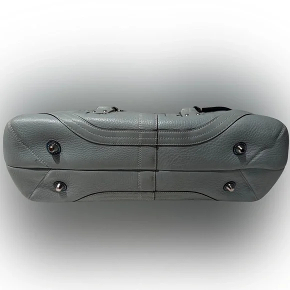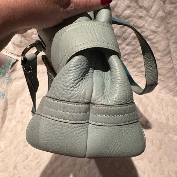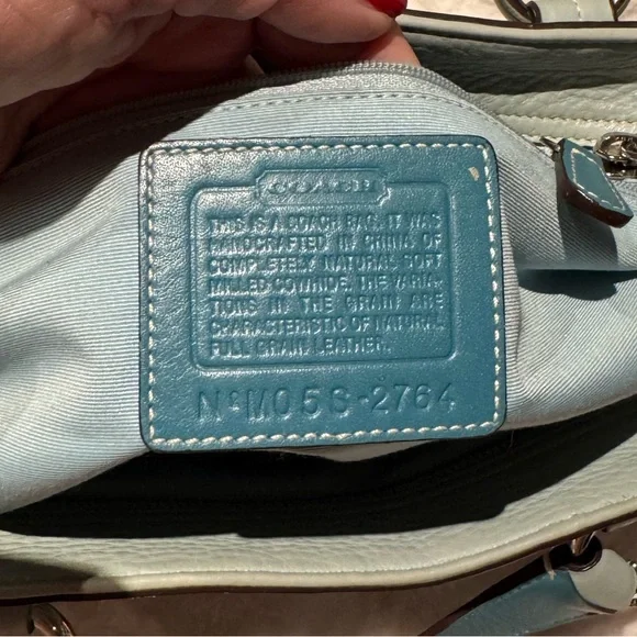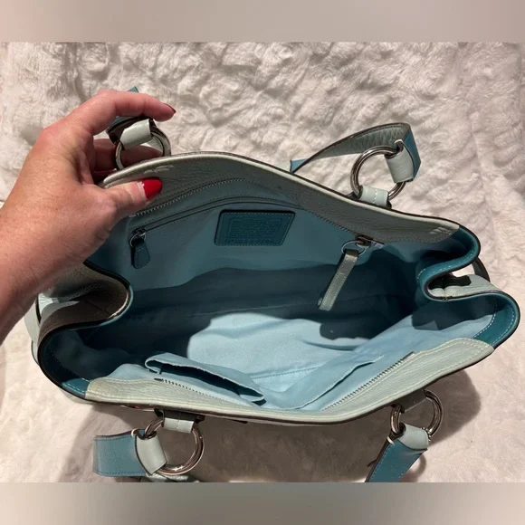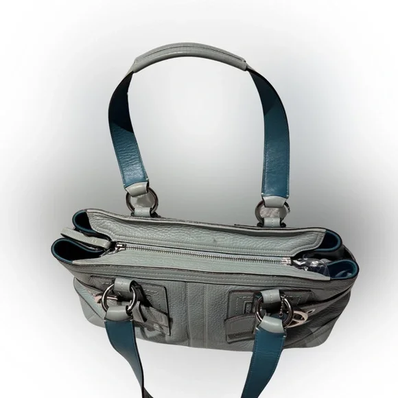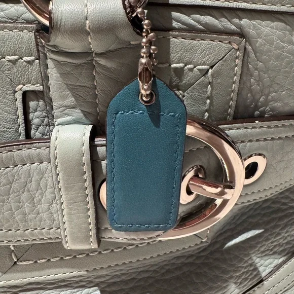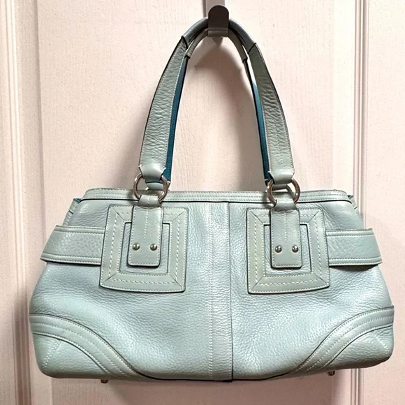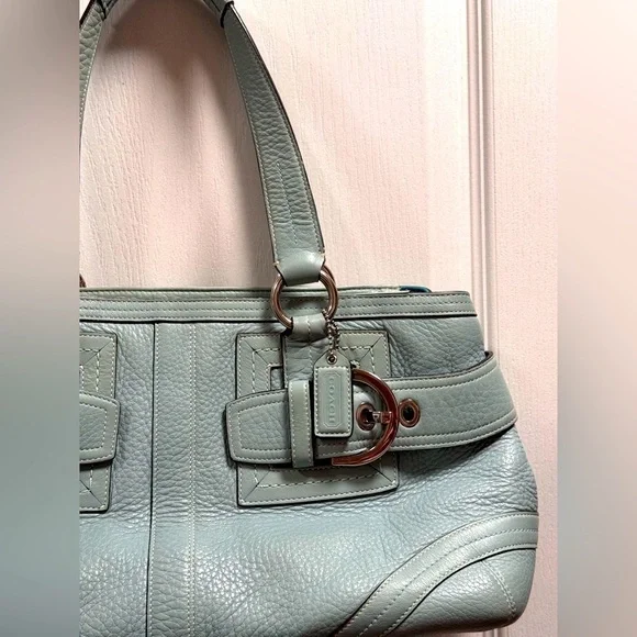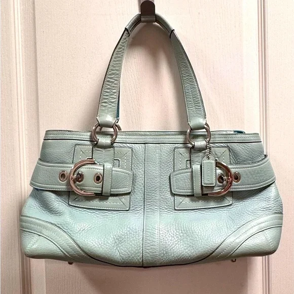 Vintage COACH Satchel in great condition• ALL SOFT LEATHER• Color is light blue green• has hang tag with different color on backside• Silver hardware including 2 faux belt buckles on the front • top Zip closure• 1 interior zipper compartment on the inside• 2 interior multifunctional slip pockets• 4 metal feet • handles are in great shape • Measurements approximately 16" x 8.5”x 5.5" • OVERALL GREAT CONDITION