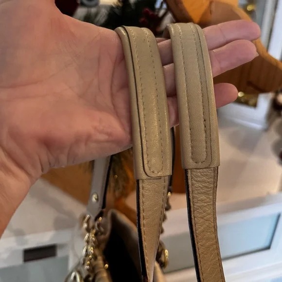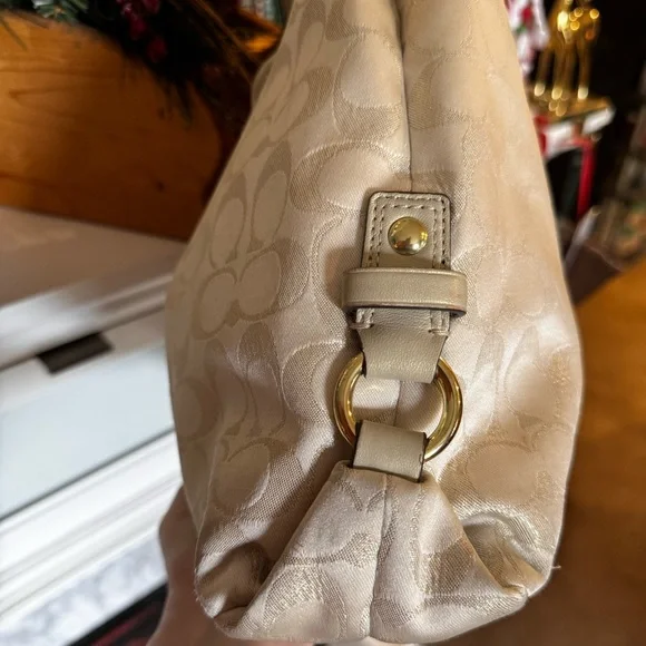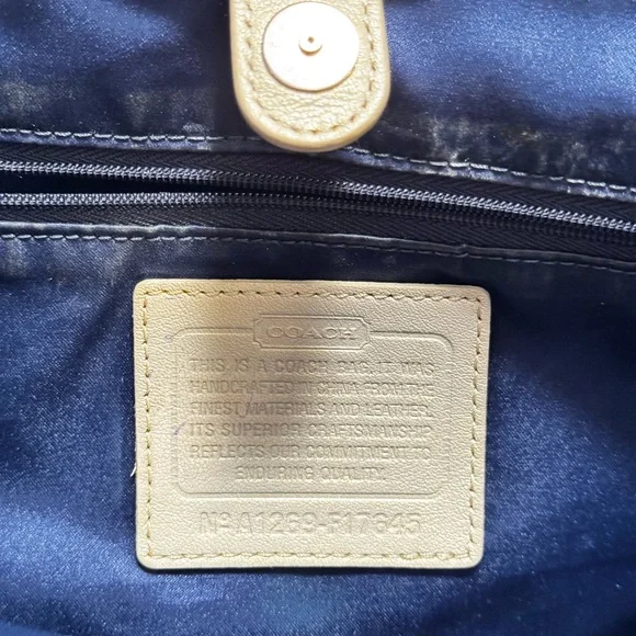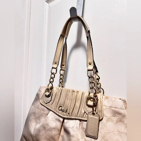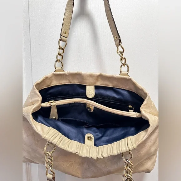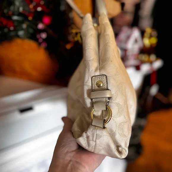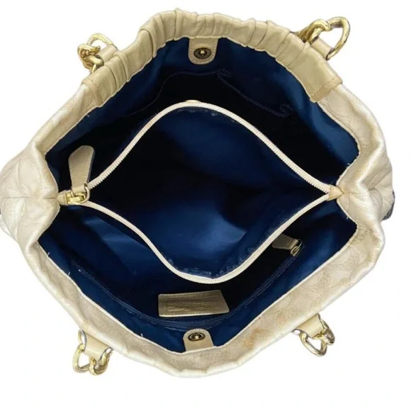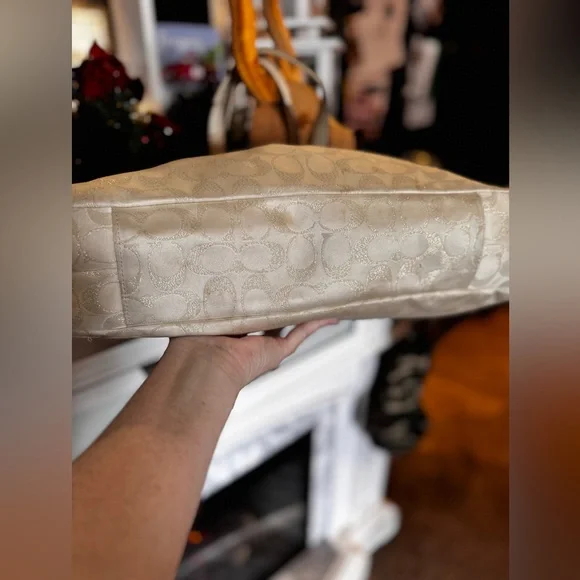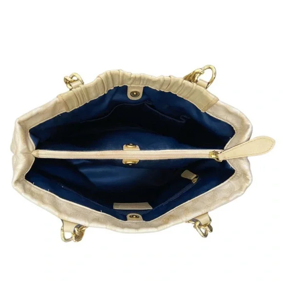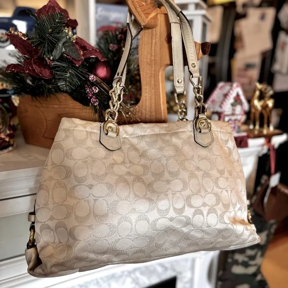 Elevate your style with the Coach champagne Signature Tote Bag. This elegant bag features a classic design, perfect for any occasion. The champagne color adds a touch of sophistication to your ensemble. Ideal for everyday use, it combines functionality with timeless fashion. COACH• Shoulder bag• Model number F17645• measures approximately 17”x10”x3.75”• Canvas with monogrammed logo in glitter and leather trim and handles• cream gold champagne glitter• snap closures• Inner pockets: 1 zipper type, 2 open types,• 1 middle partition zipper pocket• navy blue satin lining• original hang tag• Preloved in EUC• please review all photos