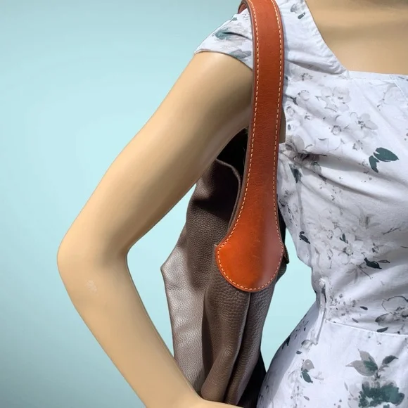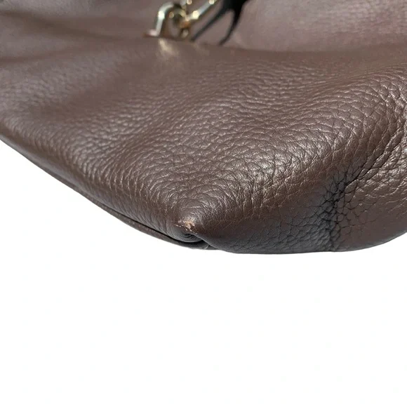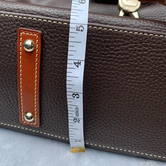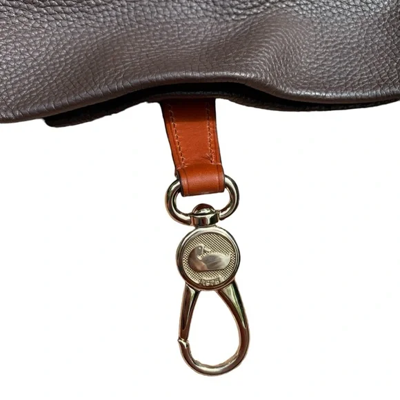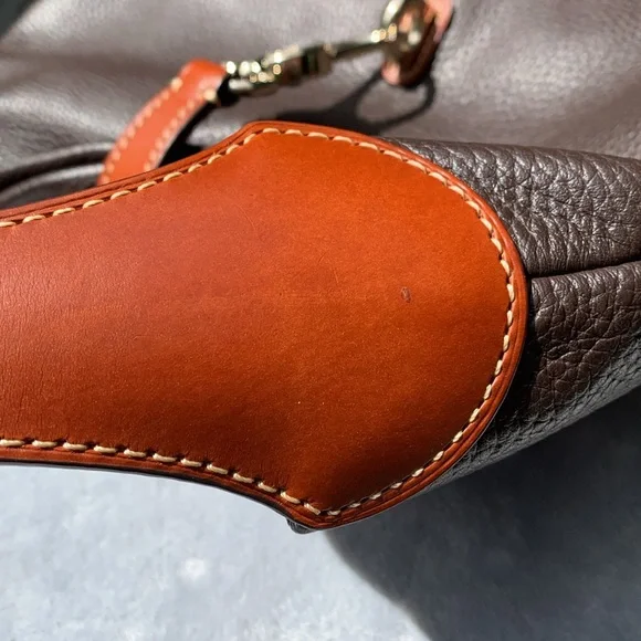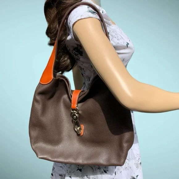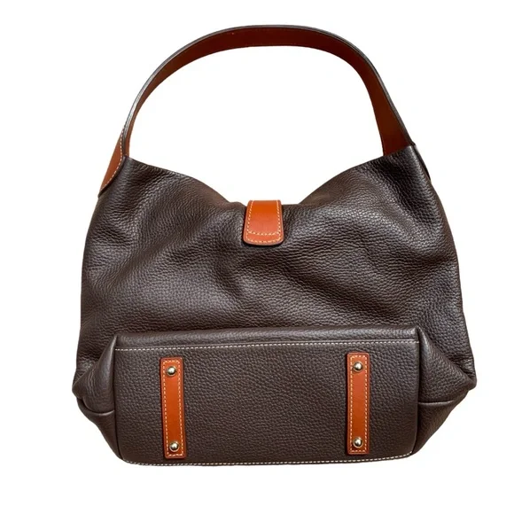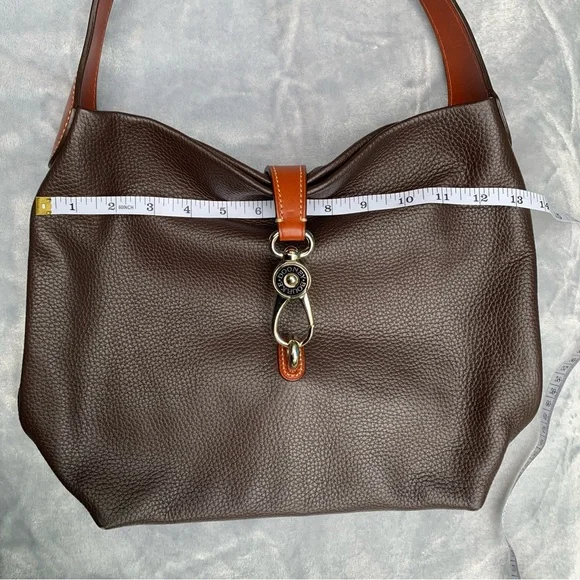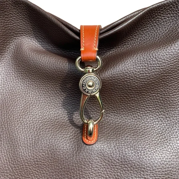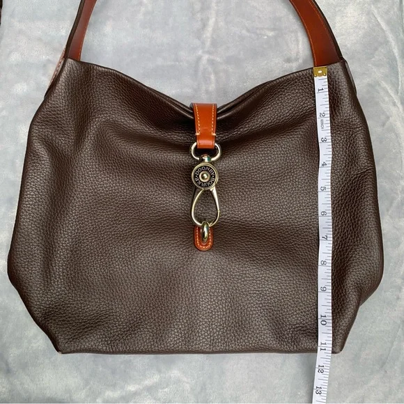 Very well-made and durable Dooney & Bourke Slouchy Hobo Style Brown Pebbled Leather Shoulder Sac Bag Colors: - beautiful chocolate brown exterior with a light brown accent strap...