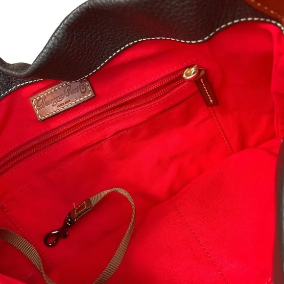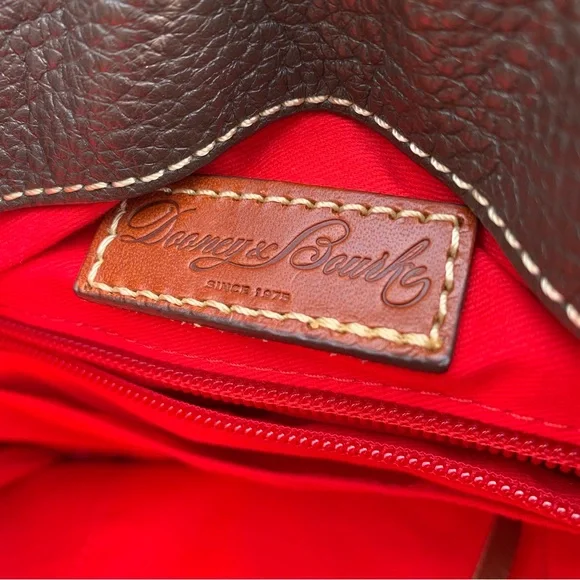 Very well-made and durable Dooney & Bourke Slouchy Hobo Style Brown Pebbled Leather Shoulder Sac Bag Colors: - beautiful chocolate brown exterior with a light brown accent strap and contrasting vibrant red interior liningSpecifics:- genuine Italian leather- pebbled leather with a textured soft and pliable finish- thick shoulder strap- signature double-sided Dooney & Bourke logo lock closure (gold-tone lobster claw clip)- one inner zip pocket and three open pockets for sunglasses, cellphone, etc. - D & B navy blue dust bag with drawstring included- attached inner key or leash clip- flat bottom with metal feet- handle drop length approximately 8”- made for quality & durabilityMeasurements: in photosCondition: very good, pre-owned; only minor wear on two bottom corners and a tiny scuff on the strap (in photos) Both casual and classically chic this bag will take you from workday lunches to Sunday brunches with ease! Pair with any outfit!A 0024