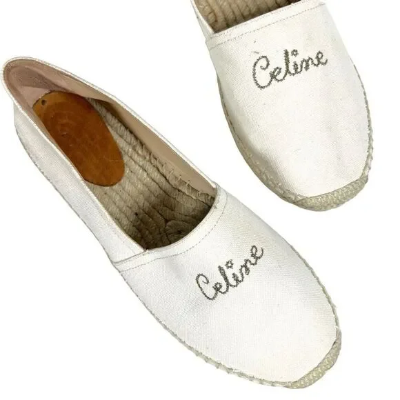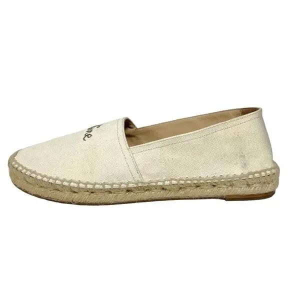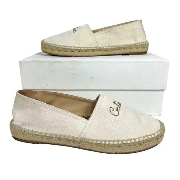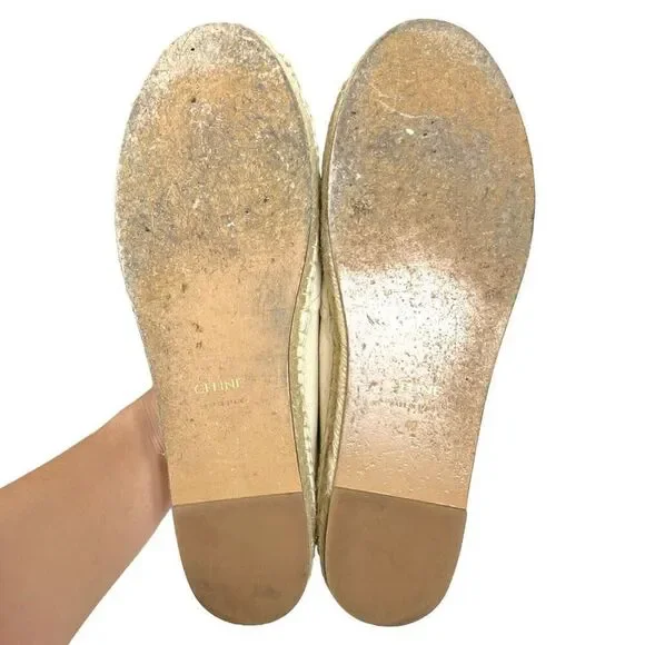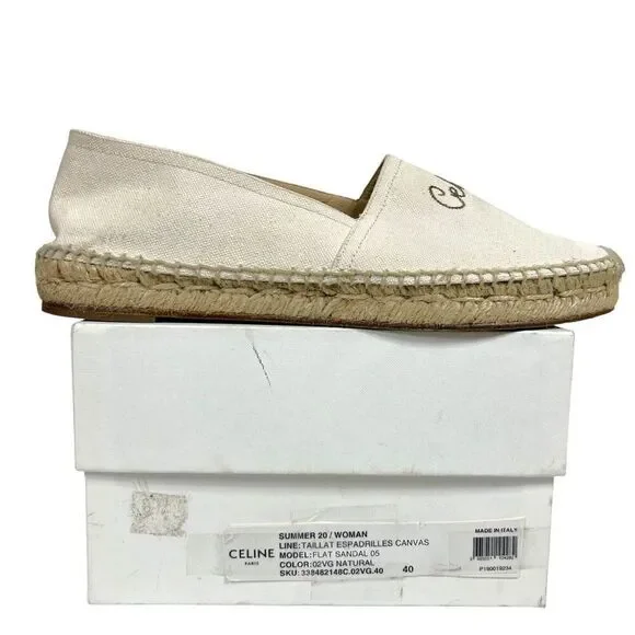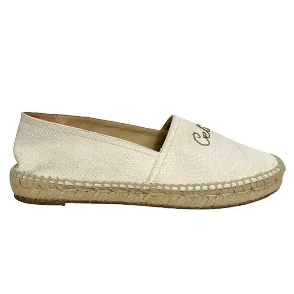 CELINE Embroidered Logo Triomphe Flat Espadrilles Canvas Cream Size 40 US 10