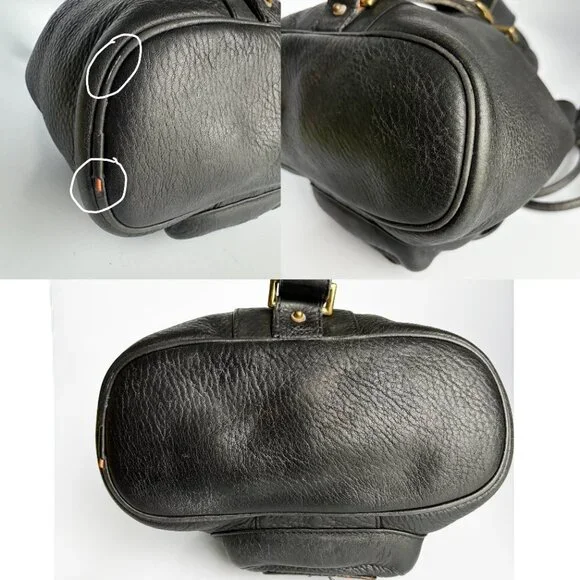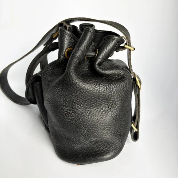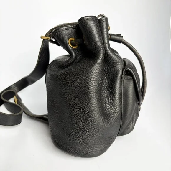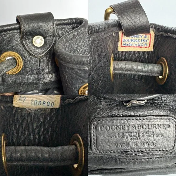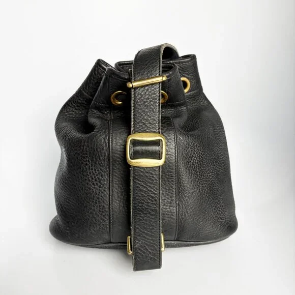Vintage Dooney & Bourke Small Sling bag, likely made in the 2000s.Made from black pebbled leather, it features a drawstring fastener and an exterior snap pocket in front.Unlined; no pockets inside.A great little bag that can adjusted for shoulder or crossbody wear.Approximate measurements: 10in H x 9.5in L x 4.5in D with a strap drop adjustable to appx 16.5in.Preowned/vintage with signs of age, use and prior wear: some rubs and curling to parts of the exterior leather; patina/verdigris to some hardware; a piece of the bottom binding is missing and the cord underneath is showing (see pic 7, circled); the interior shows some marks.