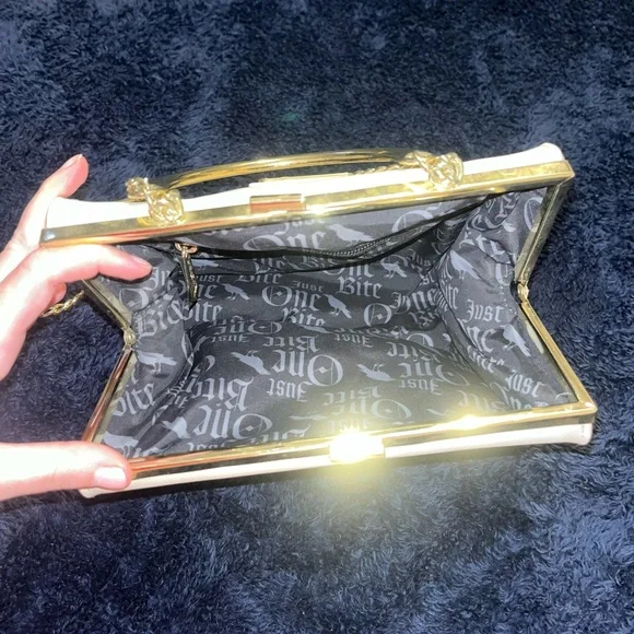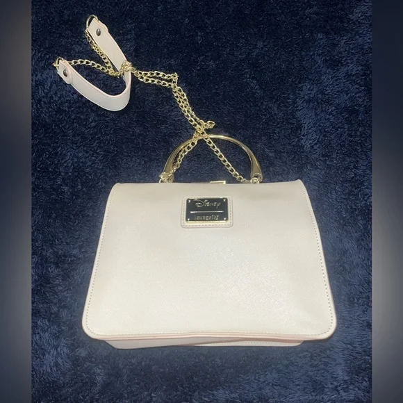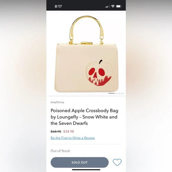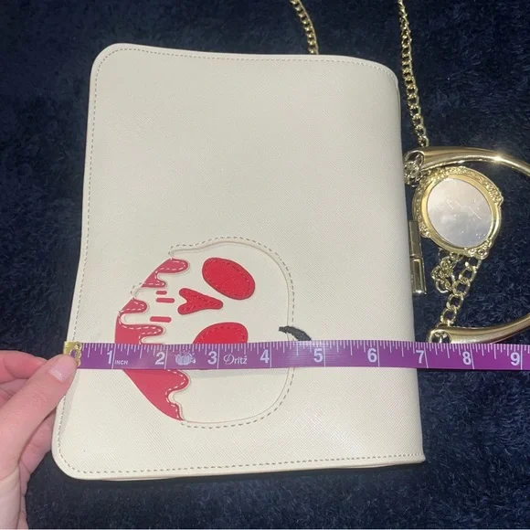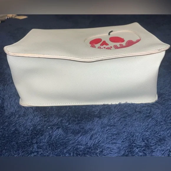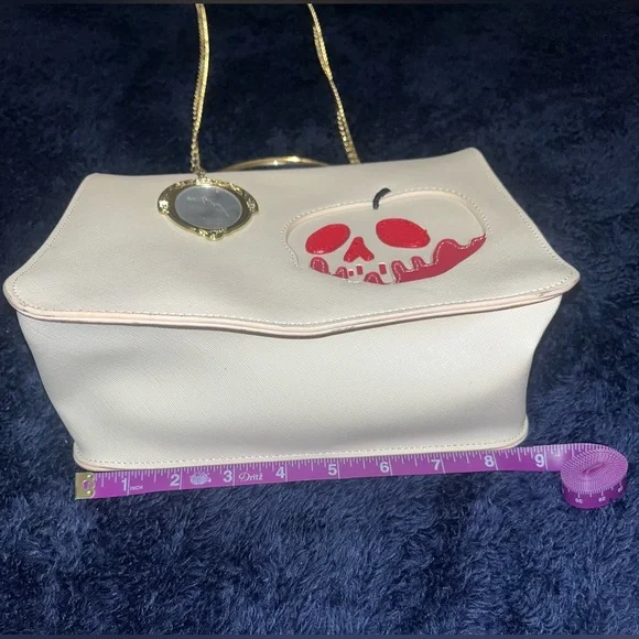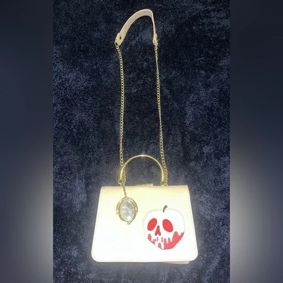 A fitting accessory for one so fair is this Poisoned Apple Crossbody Bag by Loungefly. Simulated leather and a sleek, sinister design will drive admirers mad with envy. One bite and all your dreams will come true.Magic in the detailsSimulated leather bagEmbroidered Poisoned Apple designCurved topHinged metal frameSnap top closureZip interior pocketPrint fabric liningChunky crossbody chainFaux leather shoulder strapMetal handleGolden hardwareMagic Mirror charm with chainDisney Parks X Loungefly logo label plateThis bag is in preloved condition and shows minimal signs of wear. Magic mirror charm is lightly scratched. Clean inside and out. SOLD OUT ONLINE! RARE!91012124