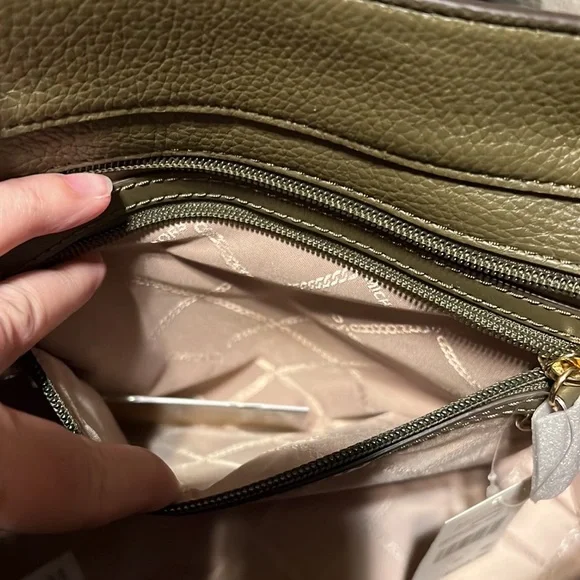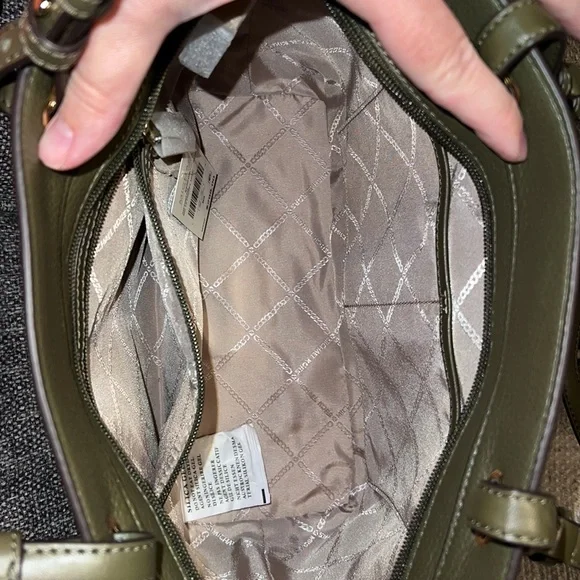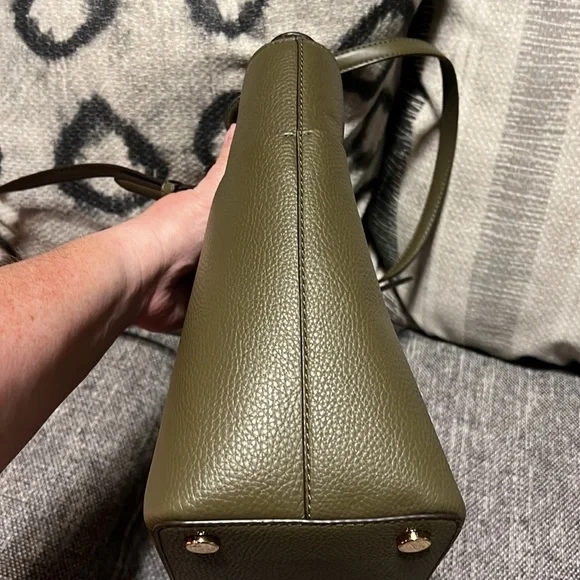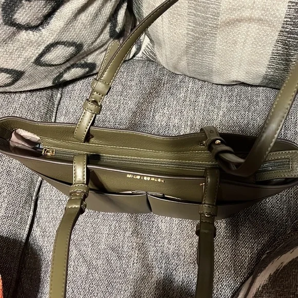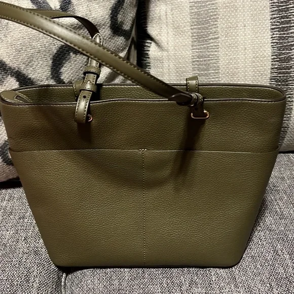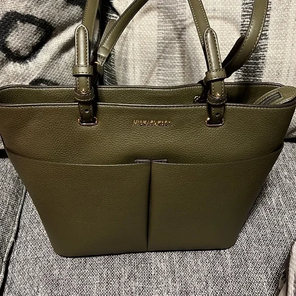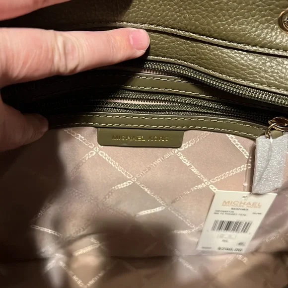 NWT MICHAEL MICHAEL KORS Bedford Medium Faux Leather Tote BagOliveTote bag • Faux leather • 75% polyurethane/25% polyester • Gold-tone hardware • 14"W X 10"H X 5"D • Handle drop: 10.75" • Exterior details: 2 back slip pockets, 2 front slip pockets • Interior details: back zip pocket, 2 front slip pockets • Lining: 100% polyester • Zip fastening New with tags