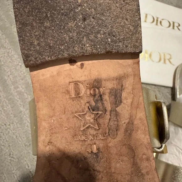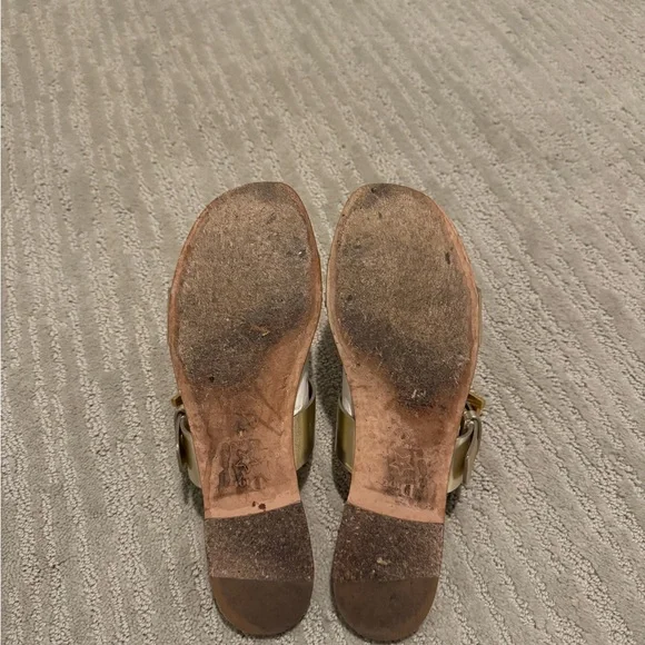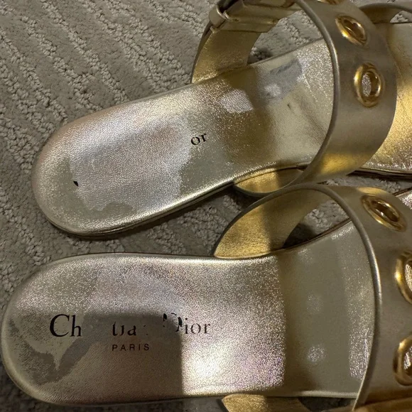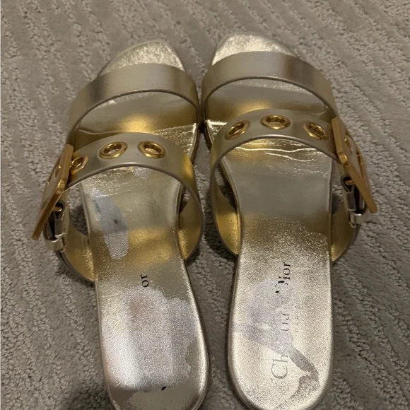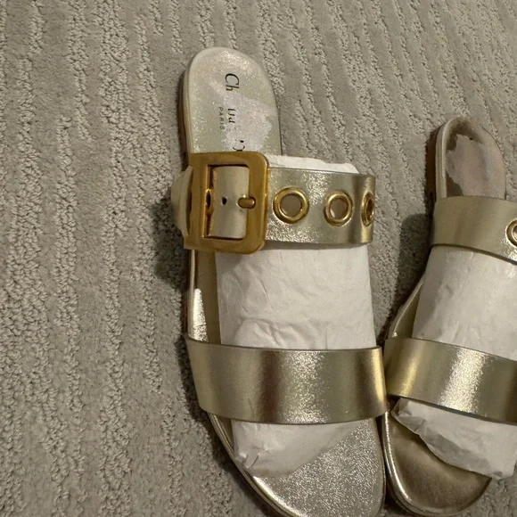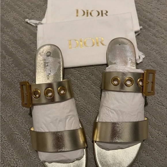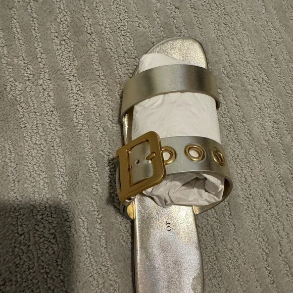 Elegant metallic gold slides with buckle detail. Perfect for adding a touch of luxury to any outfit.