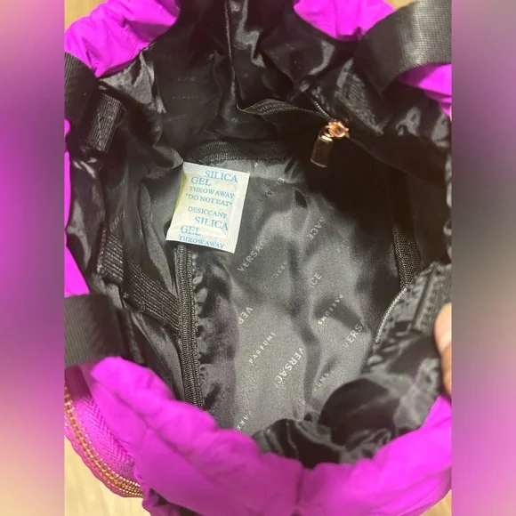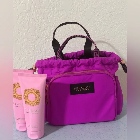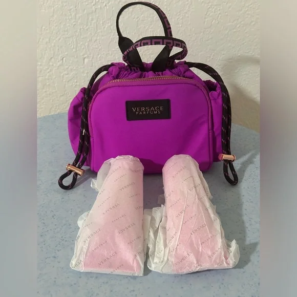 Versace Parfums Cosmetic Makeup Bag Purple Color Wallet Case with gift that are a shiny cream and gel. The bag smells amazing and the gift has the same fragrance. All new without...