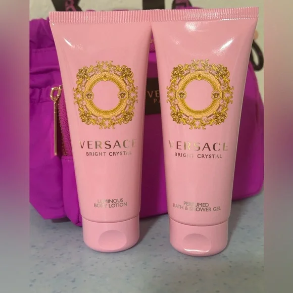 Versace Parfums Cosmetic Makeup Bag Purple Color Wallet Case with gift that are a shiny cream and gel. The bag smells amazing and the gift has the same fragrance. All new without box.