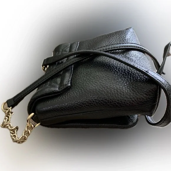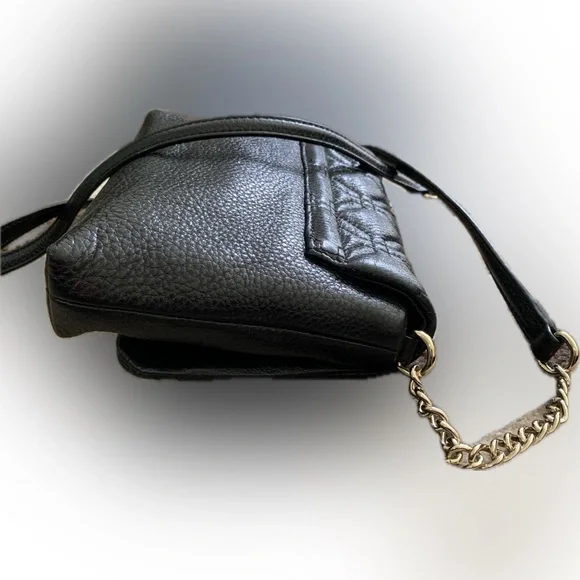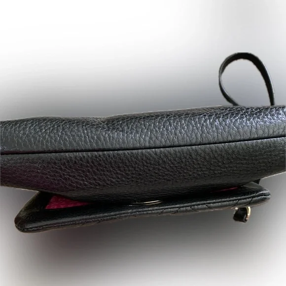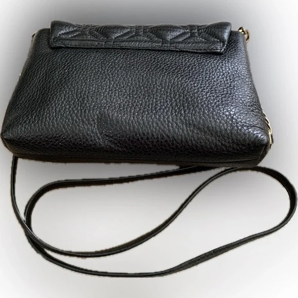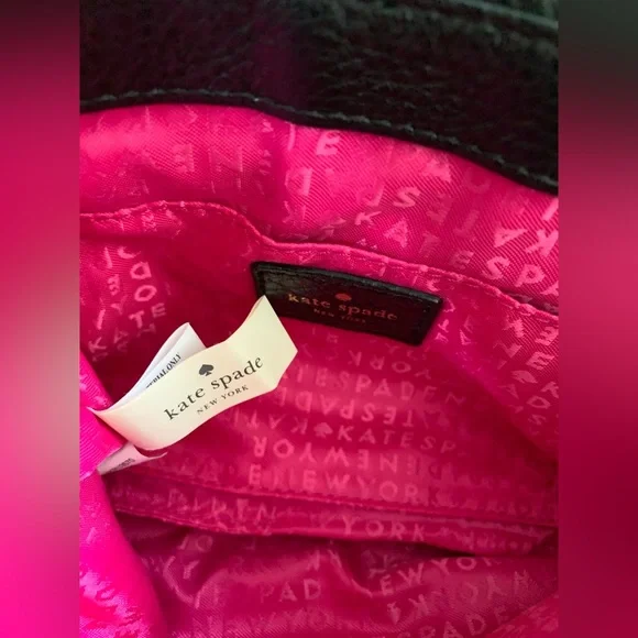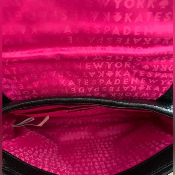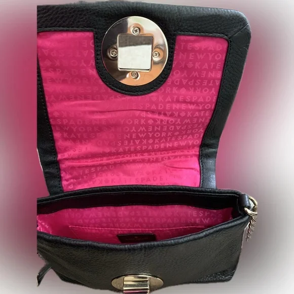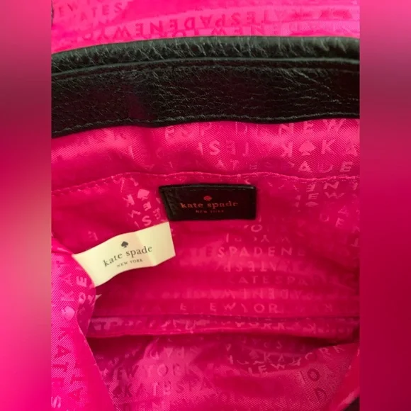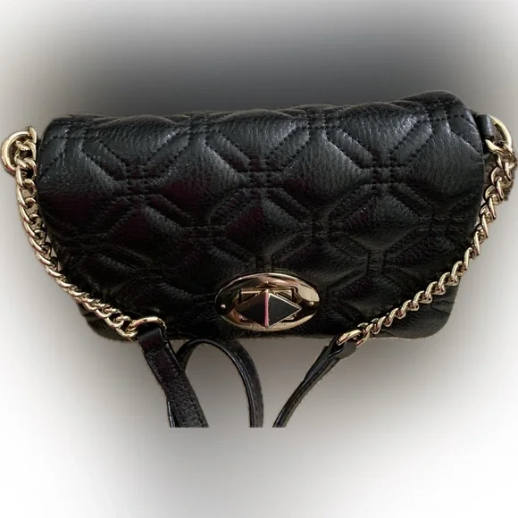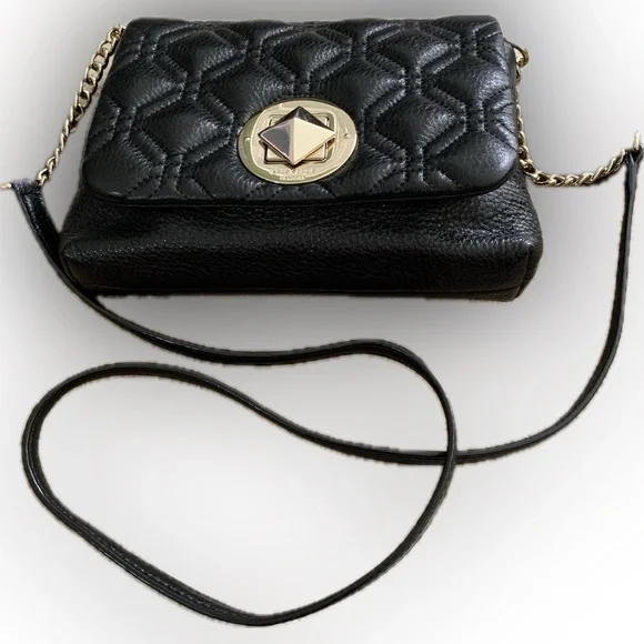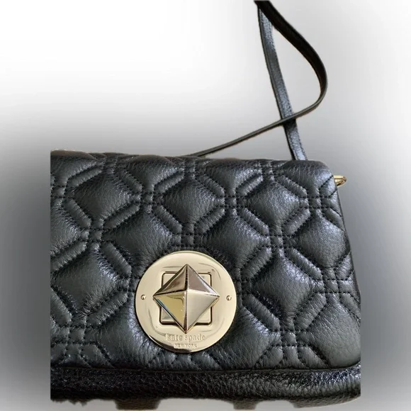 DESCRIPTION:Black quilted leather Kate Spade New York Astor Court Naomi crossbody bag with light gold-tone hardware, single chain-link and leather shoulder strap, pink jacquard...