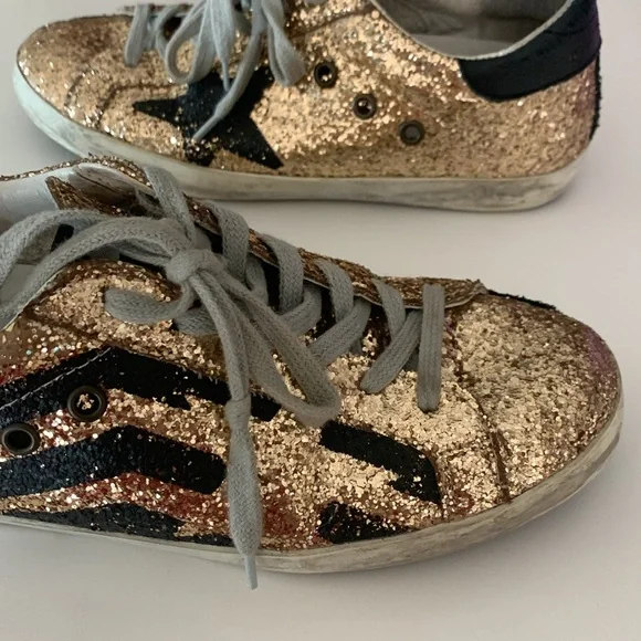 Golden Goose superstar sparkle star sneakers Size 37 Excellent condition Golden Goose Superstar gold black sparkles Questions? Leave a comment below!