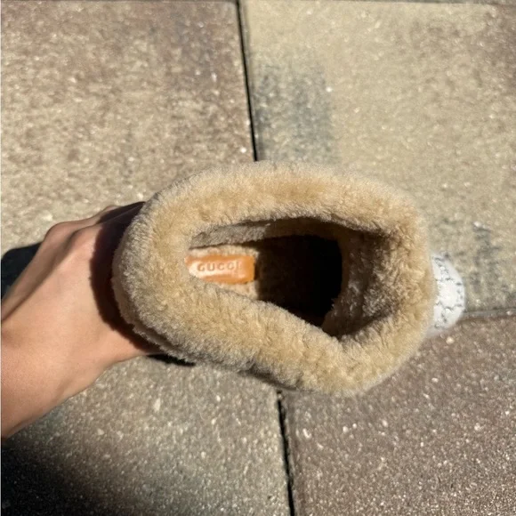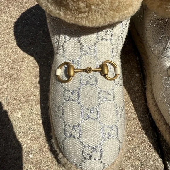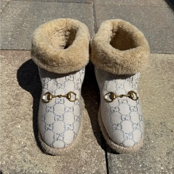 Excellent Condition! Worn few times.Women’s Size 39 (8.5 U.S)Do your wardrobe a favor with these authentic shearling-lined boots featuring the iconic GG monogram canvas. Designed for both luxury and comfort, these boots boast:+ Plush shearling lining for warmth and coziness+ Durable espadrille-style sole for a unique look+ Neutral beige and brown tones that pair effortlessly with any outfitPlease feel free to send offers and message me for any further questions!