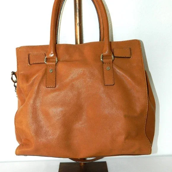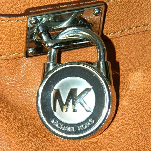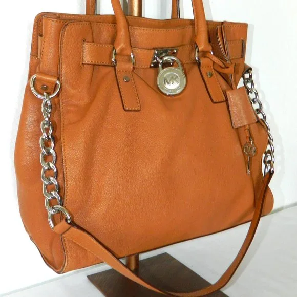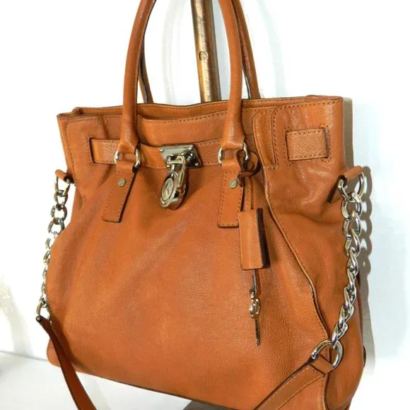 Hamilton Satchel by Michael KorsCamel leatherMonogram liningSilver tone hardwareMichael Kors lock and keyDouble top handle with chain link shoulder strapFour metal feetRetail $558Accessories: Lock & KeyMeasurements: 14"L x 12"H x 5"D with a 5" top handle strap and 11" shoulder strapCondition:Excellent