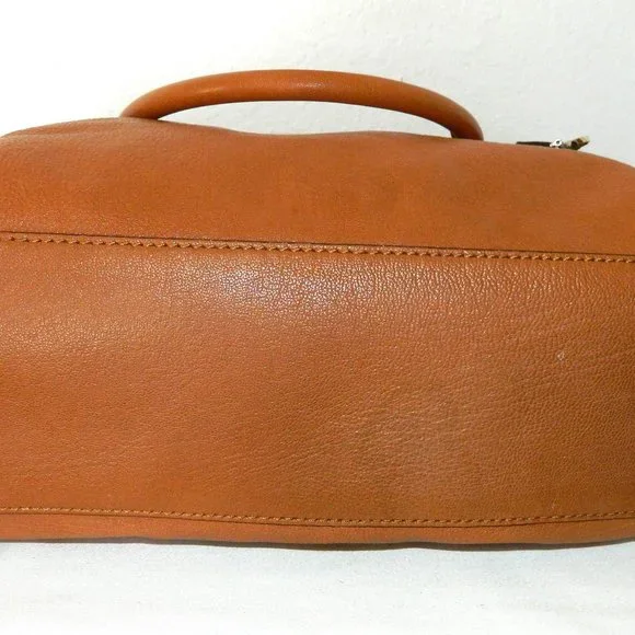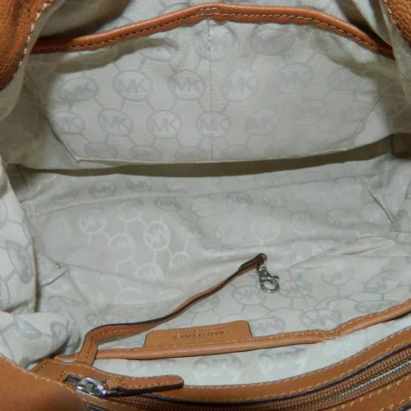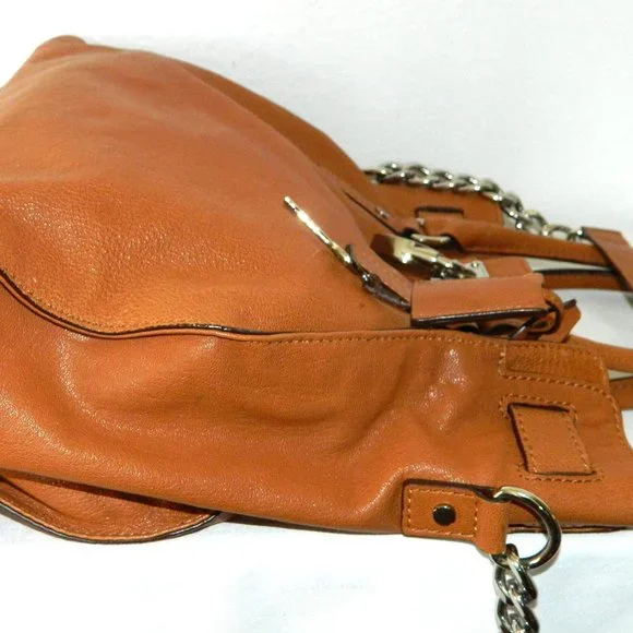 Hamilton Satchel by Michael KorsCamel leatherMonogram liningSilver tone hardwareMichael Kors lock and keyDouble top handle with chain link shoulder strapFour metal feetRetail...