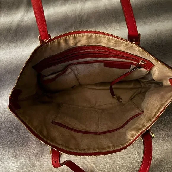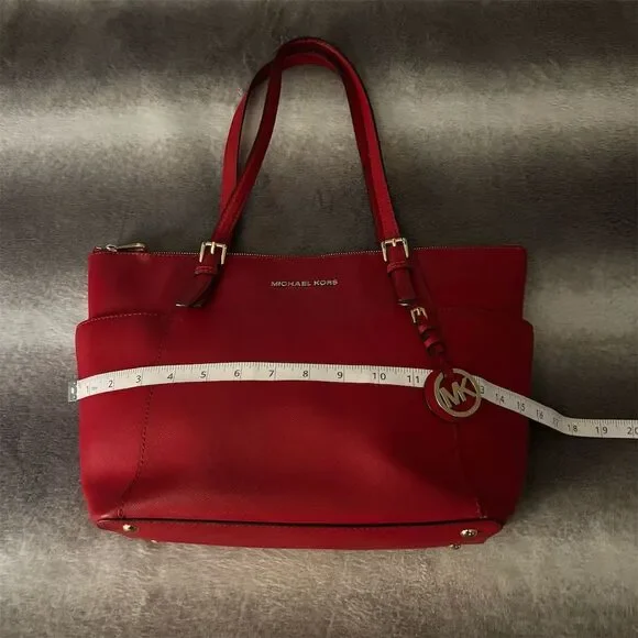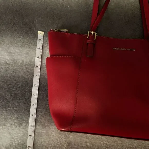 Introducing the Michael Kors Jet Set Large Crossgrain Leather Top-Zip Tote Bag in a striking Cherry Red. This tote is your perfect companion for casual outings, offering a spacious interior and two side slip pockets to keep your essentials organized. The comfortable shoulder straps make it easy to carry, while the gold-tone hardware and signature MK charm add a touch of elegance. Whether you´re heading to brunch or a day of shopping, this tote complements any casual occasion. Pre-owned in excellent like new condition and ready to add a pop of color to your wardrobe.Keywords: Michael Kors, tote bag, crossgrain leather, cherry red, large tote, shoulder strap, gold hardware, MK charm, casual bag, spacious interior, pre-owned, women´s fashion, top-zip closure, side slip pockets, stylish accessory.Brand: Michael KorsExterior material: Crossgrain LeatherStyle: ToteExterior color: Cherry RedDepartment: WomenLining color: RedHandle/strap color: RedHandle/strap material: LeatherSize: LargeHardware color: GoldClosure: Top-ZipAccents: Signature MK charmFeatures: Spacious interior, Two side slip pockets, Comfortable shoulder strapsOccasion: CasualHandle style: Shoulder Strap