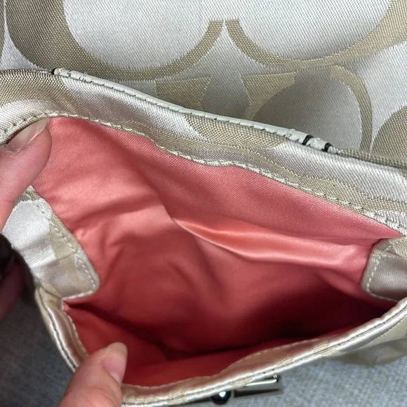 Coach Satin White/Champagne Shoulder Crossbody BagExcellent exterior and hardware. Some minor marks to interior and interior zip pocket.Silver hardwareWhite leather, champagne satin Coach signature fabric, pink satin interiorIncludes large white leather hang tagFront pocket, magnetic snap closure.13” across11” tall5” depthCrossbody drop: 16”Shoulder strap drop: 6”