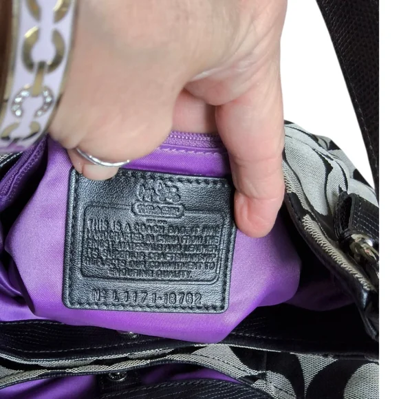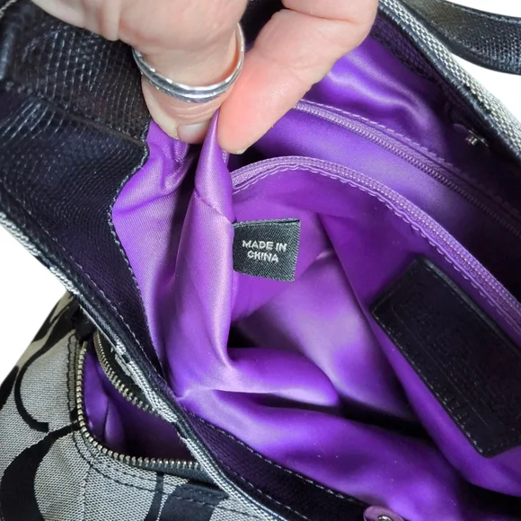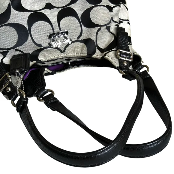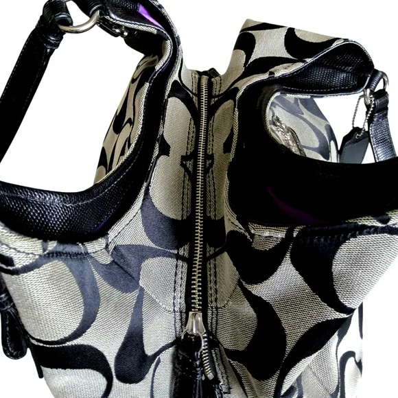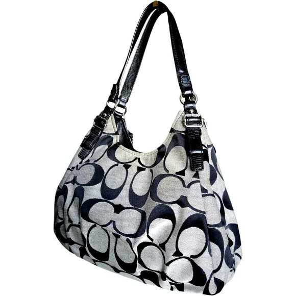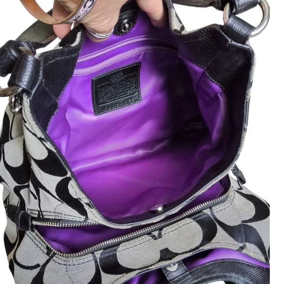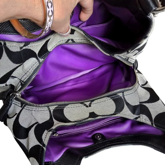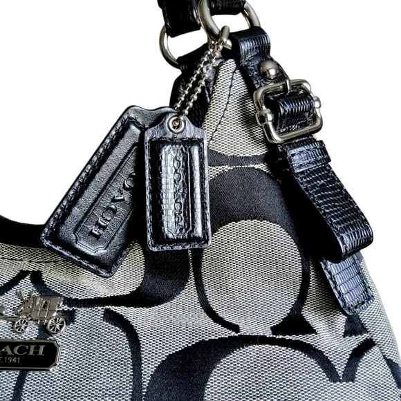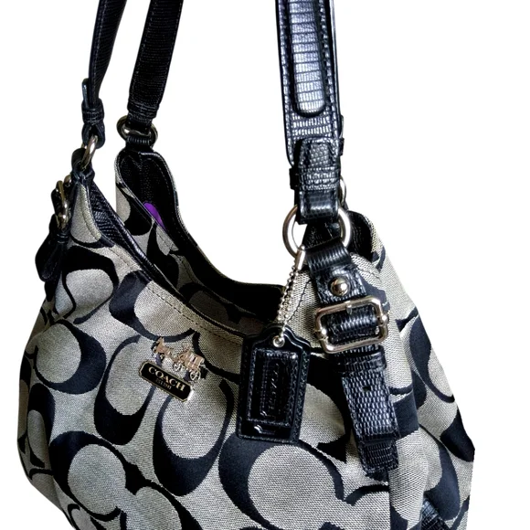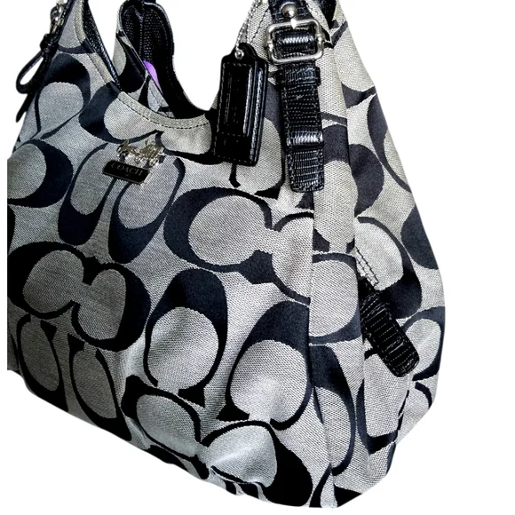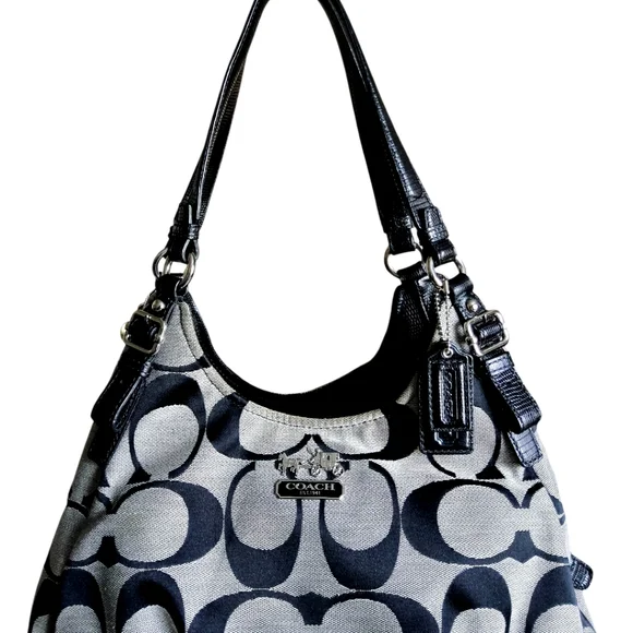 Elevate your style with the Coach Madison Maggie bag. Featuring a chic black and grey Signatrue C design, this bag is perfect for any occasion. Enjoy the luxury and elegance of Coach.Signature Jacquard in Black and Grey Black Lizard Embossed Leather Trim 2 Hang Tags - one smooth black leather, and one lizard embossed black leather Double Handles with a 10 inch Drop Metal Coach Horse and Carriage Logo Faceplate on front of bag 3 Compartment Bag - (1) Center Compartment with Zip Closure (2) Back Compartment with Snap Closure and 1 Zip Pocket (3) Front Compartment with Snap Closure and 2 interior slip pockets Deep purple sateen lining Ruched bottom 15 inch Length 11 inch Height 4 inch Depth 2011 Bag Excellent preloved condition #coachmadisonmaggie #coachblackandgreybag #coachsignaturejacquard #coachhobobag