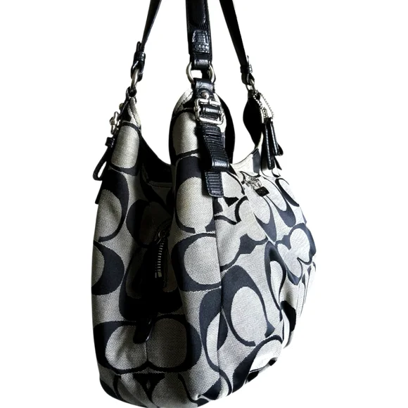 Coach Madison Maggie Black and Grey Signature Jacquard Hobo Shoulder Bag