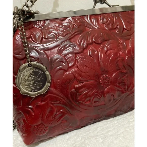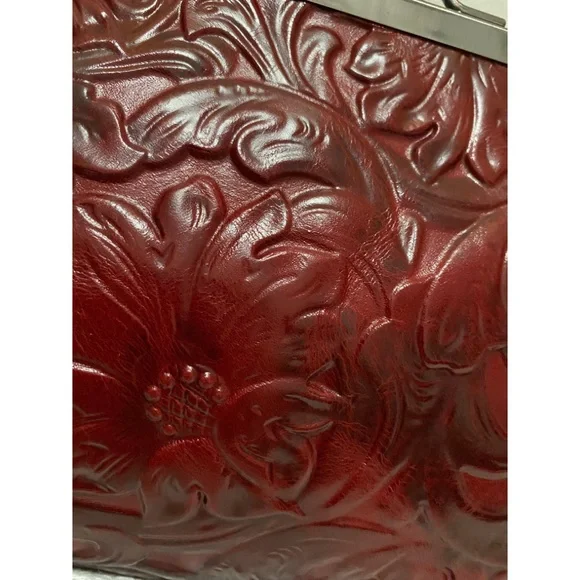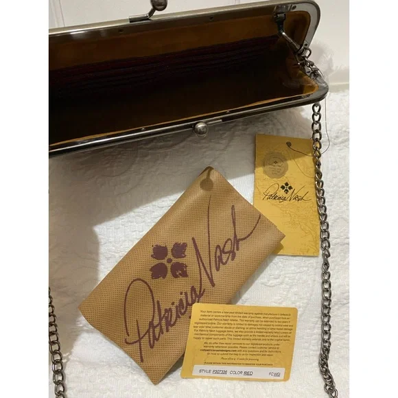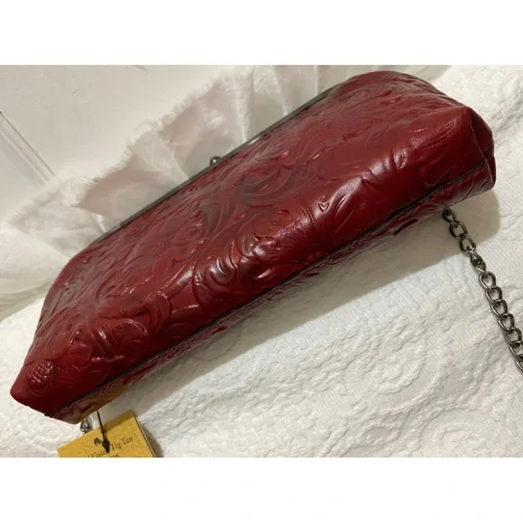 Tooled Vintage Veg Tan Collection Patricia Nash Potenaz Leather Frame Clutch .No longer made exclusively for fancy parties and elegant evenings out, the classic clutch is making a play for your everyday look. This super-chic, convertible version of the one stashed in the back of your closet features rich leather and a removable, chain-link crossbody strap that transitions from shoulder bag to clutch with ease.*Potenaz Clutch*Color ~Red100% full-grain leatherInterior: main compartment with 8 credit card slots. Faux suede lining, 100% polyesterExterior: signature metal frame, deep embossed logoKisslock closureSignature antiqued metal hardware, heavy handcrafted stitchingDimensions: 11"(W) x 5 1/2"(H) x 2"(D)Strap drop: 19"Coin drop: 3"Coin diameter: 1 1/4"MSRP $129.00Please view all photos carefully as they are part of the description.