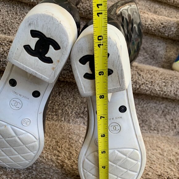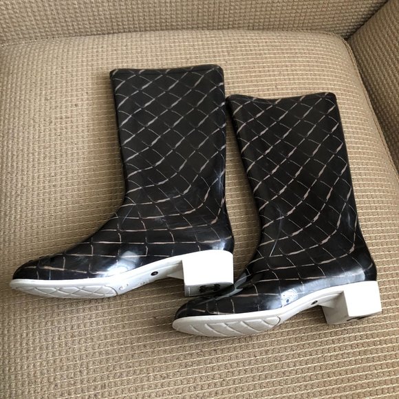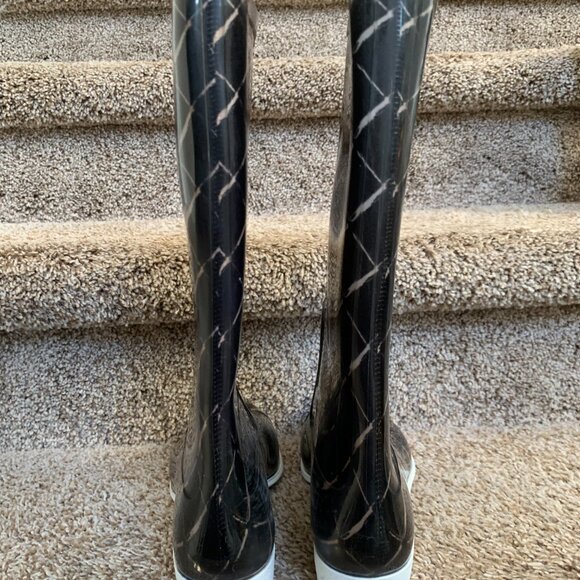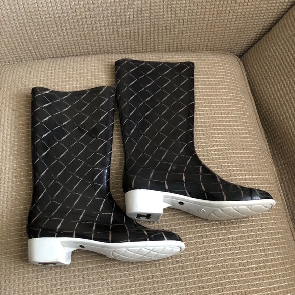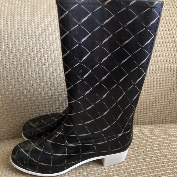Women´s Black/ WhiteMid-Calf Quilt Printed Rubber Rain Boots. Size EU 39. US 8.5In very good condition with signs of use. Shows some scuffs and scratches.From the 2008 Collection by Karl LagerfeldBlack. Interlocking CC Logo & Quilted PatternHeight(in): 13 "Heels(in): 1.5"Size: EU 39 (Approx. US 9) Regular (M, B)