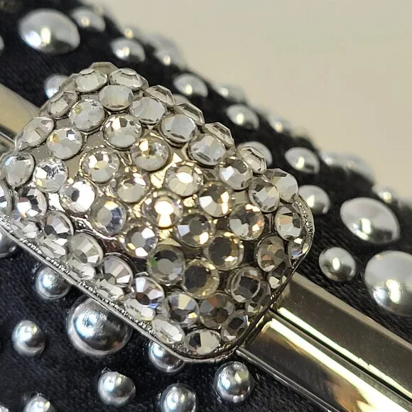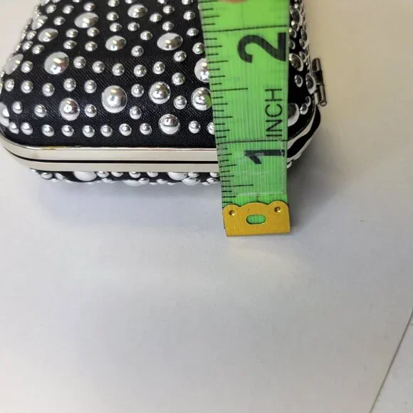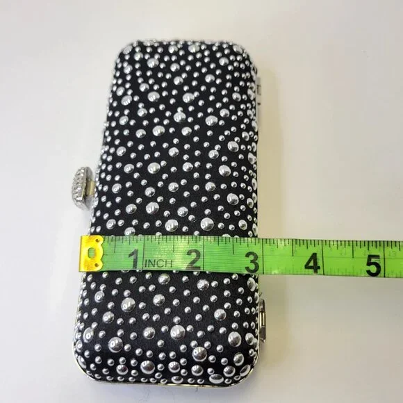Black Evening Purse with Shiny metallic studsRectangular shaped, Easy to Grip with different sized metallic studs all over.Really cute, small and easy to hold onto Long detachable chain strapUse it as a Clutch Purse or worn over the shoulder or crossbody for easy wining and dining, mingling and dancing.Closure: Press Clasp to openBrand New ! - Never Used, Never WornSee Measurements in listing abvApprox. Length: 7" Width: 3" Height: 1"Black interiorA Samsung S21 sized cellphone does not fit inside this pursePls Note: Gorgeous purse indeed. Clasp is tad different than the usual bags as you have to press it ,sometimes a few times,to unlatch the grip.Can be a bit fussy for the impatient.Pls Note: Exact and accurate colour of item may vary due to our lighting sources or different devices settings or our minimal editing for background clarity and brightness.Usage of our color descriptors are entirely subjective, approximate, and may vary. General Caveat for our items: All items are New( without tags), never been used, never worn but for some items, mere environmental elements may result in some natural occurring oxidation/tarnishing on some parts of an item and/or superficial light markings may be present from shipping/handling so pls note All items are sold as is.EP 30