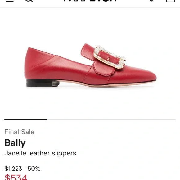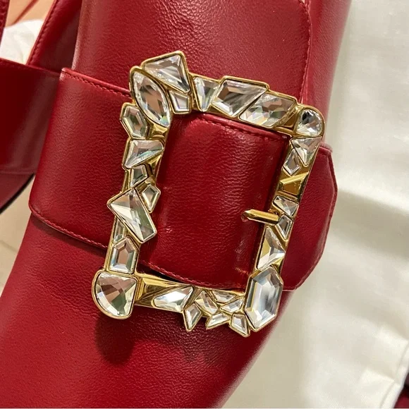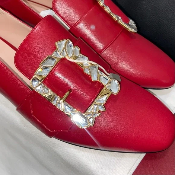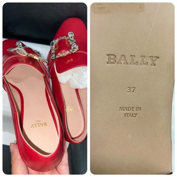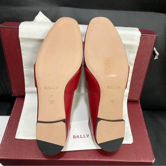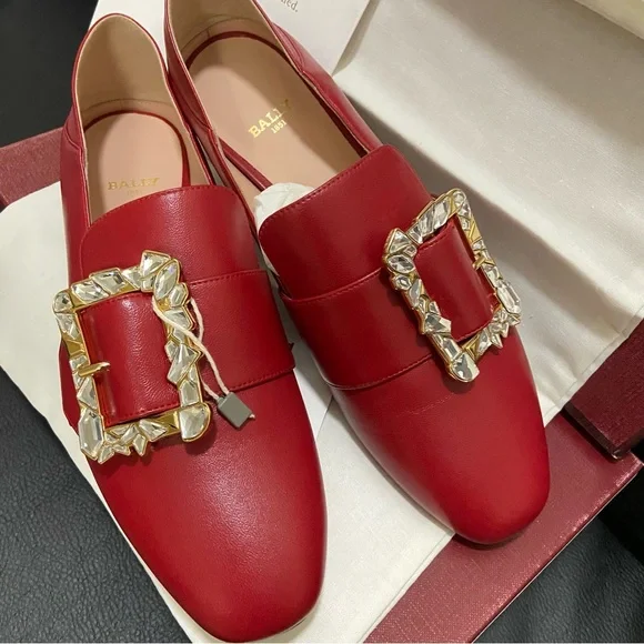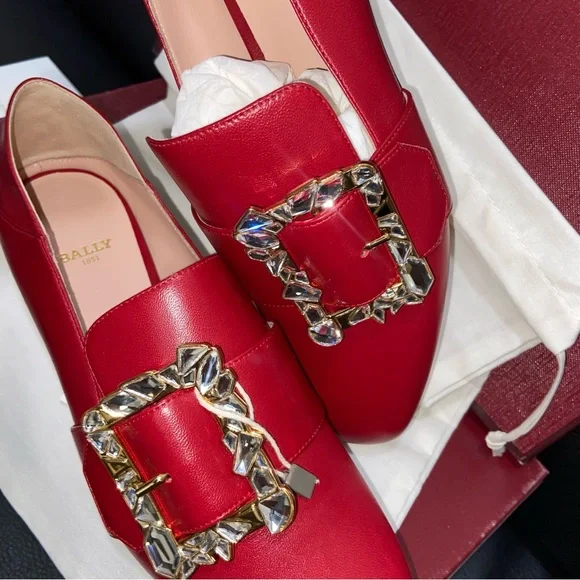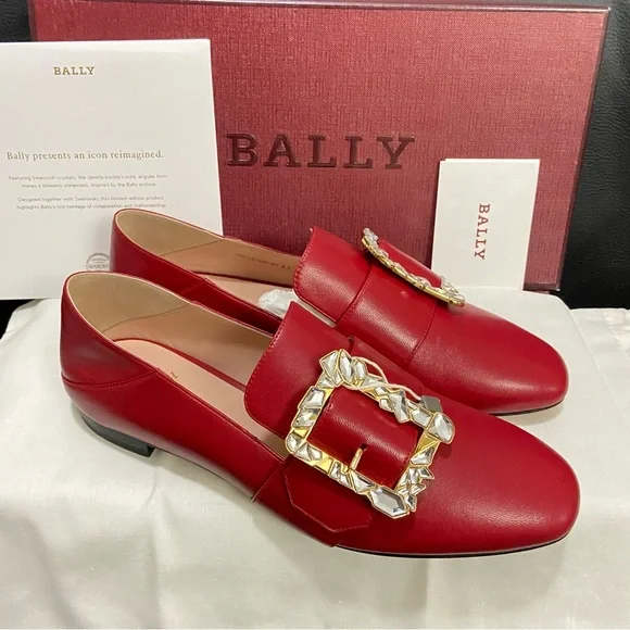 Brand new with tags and box.MSRP $950Limited edition BALLY Janelle Leather Loafers Flats with Swarovski Crystal Embellished BuckleColor: Lipstick RedMaterial: Lamb leather upperLeather insoles and outsole Size: US Women’s 6.5 EU 37featuring pointed toe, branded insole, flat rubber sole, crystal-embellished buckle fastening and babouche counter to the rear