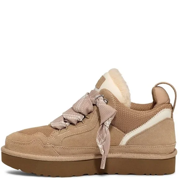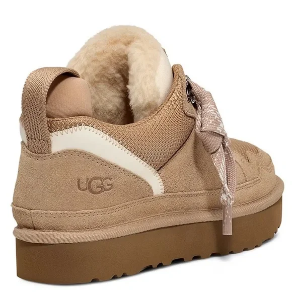 From UGG®, the Women´s Lowmel Suede and Mesh Sneakers feature:Recycled ballistic canvas mesh and suede upperWebbing heel strapUGG® logo patchEmbossed UGG® logoPadded collarOversized padded tongueTwo-tone flat laces made from 100% UNIFI recycled polyester fibersAdditional set of laces includedPolyester mesh lining made from 55% coffee charcoal modified polyester and 45% regular polyester, 10mm UGGplush™ 60% upcycled wool, 40% lyocell lining10mm UGGplush™ 60% upcycled wool, 40% lyocell insoleEVA footbedSugarSole™ EVA outsoleFlat heelNO BOX!