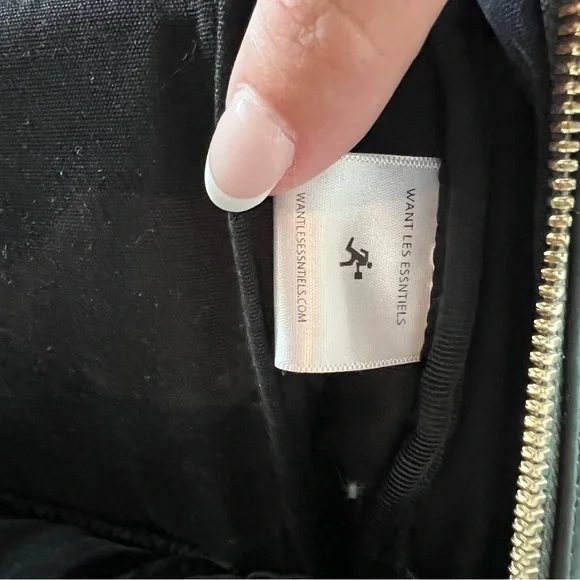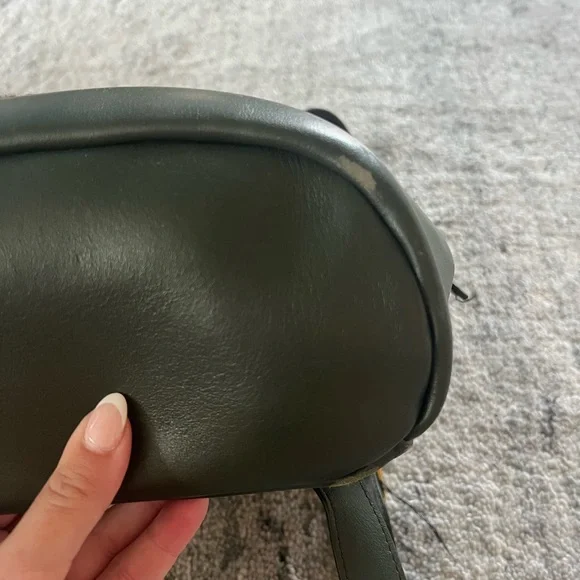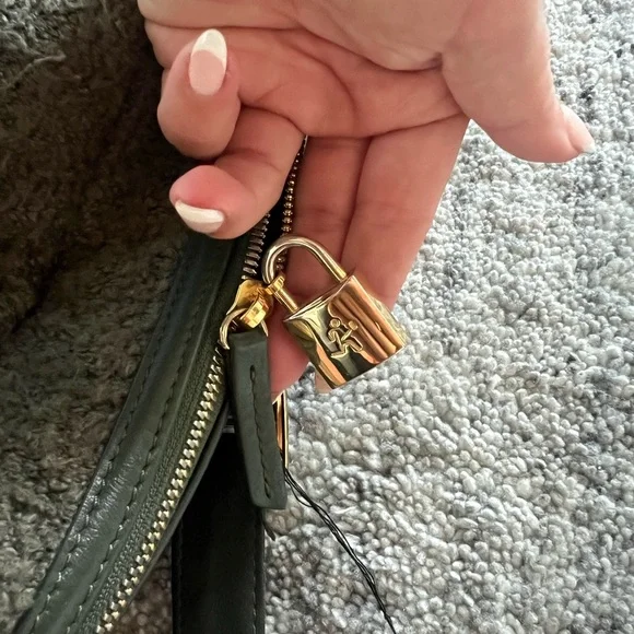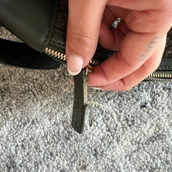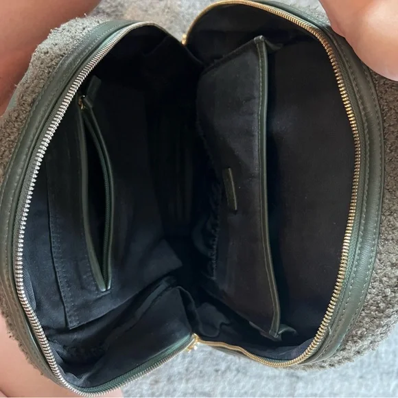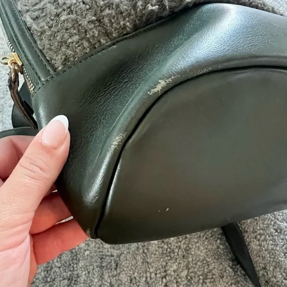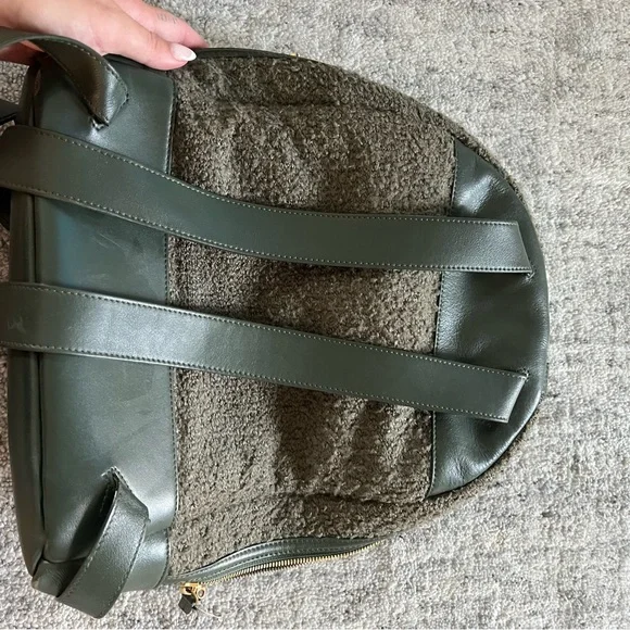 - shows signs of wear in the bottom and the zipper - i LOVED this backpack so it is well loved.- very functional with computer pocket, 2 pen pockets and an interior zip closure- no staining- comes with dust bagmultitone hardware, green leather accents, single flat top handle, adjustable shoulder straps, single exterior pocket with zip closure, foil stamped logo at front, black canvas lining, four pockets; one with zip closure at interior walls and two-way zip closure at top.