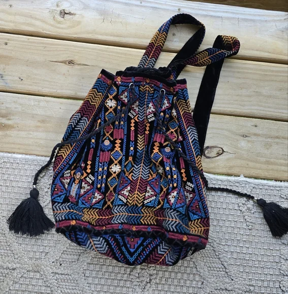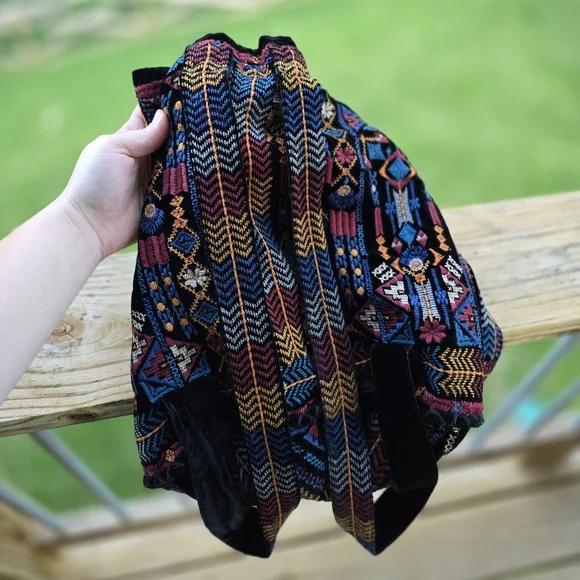 Johnny Was Cleo Velvet Drawstring Backpack In Blackexcellent condition only carried a few times!incredibly soft velvet with beautiful embroidery and stitching throughout very spacious too!