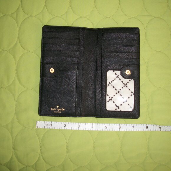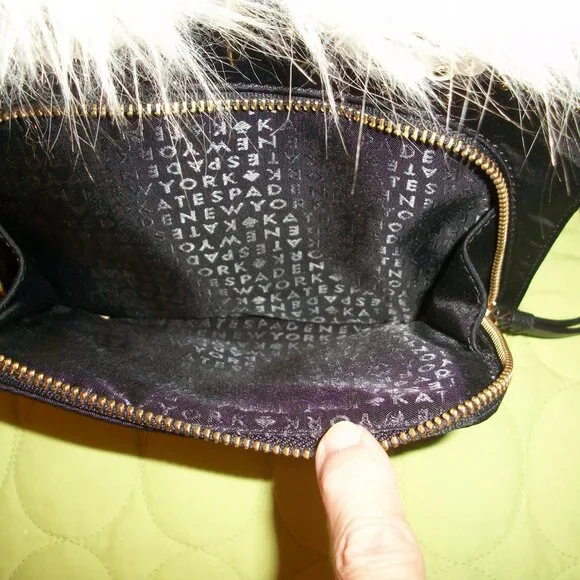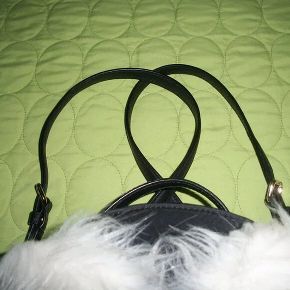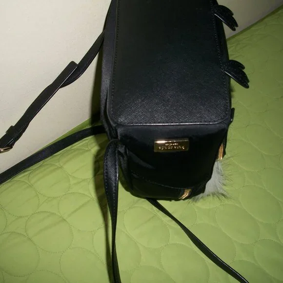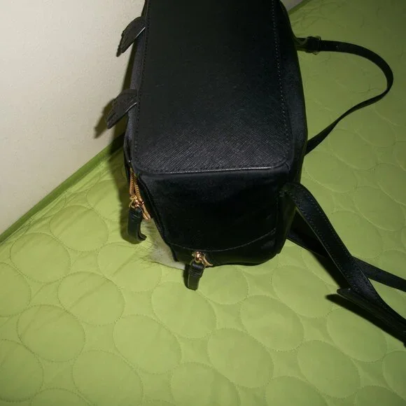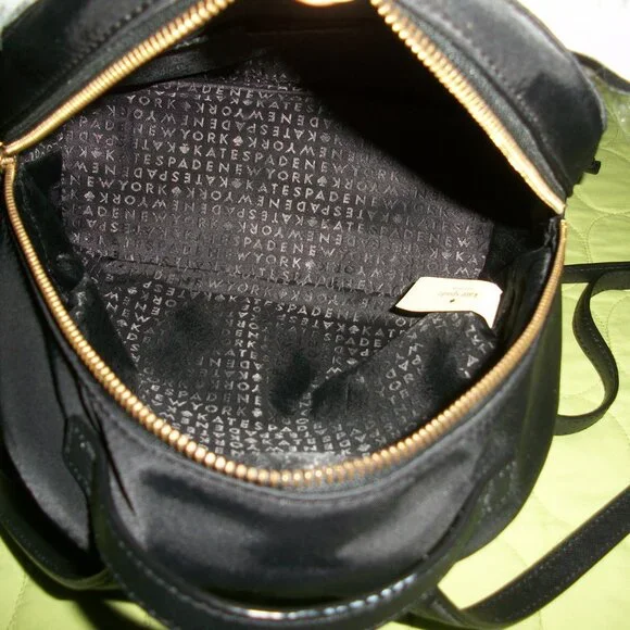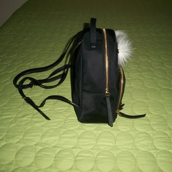 This Kate Spade New York backpack features an adorable owl character with star accents on a black nylon and leather exterior. The bag measures 8.7" in width, 9.5" in height, and 4" in depth, making it a medium-sized backpack perfect for everyday use. The gold hardware and black leather straps add a touch of sophistication to the playful design.One pocket with zipper on front.Zip closure on top.Inside, the bag is lined with black nylon that features the Kate Spade New York logo. The bag has a single handle 1.5" on top and black leather straps 27" for comfortable wear as a backpack. This backpack is perfect for any woman looking to add a touch of whimsy to her daily routine.The bag is in a great pre-owned condition, only on front there is a tiny light stain.Shell 100% nylon.Trim 57% TPU 29% polyurethane 14% metalic fibres.Lining 100% polyester.Wallet L 7" H 3.5" is in a very good condition, only gold hardware shows a bit of wear.