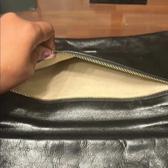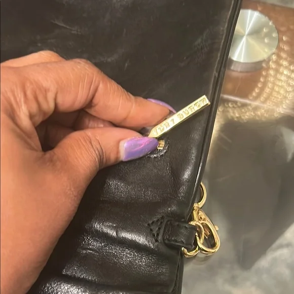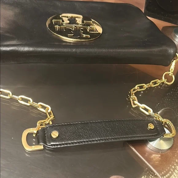 This Tory Burch briefcase showcases a sophisticated blend of black leather and gold-tone hardware, highlighted by the iconic circular logo emblem. Its structured design and smooth...