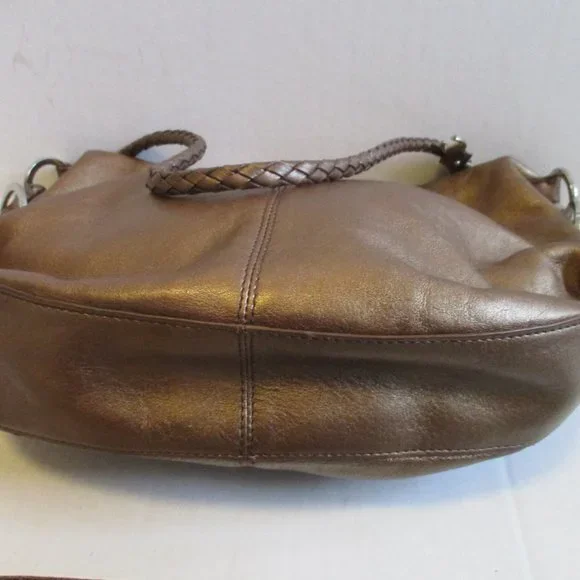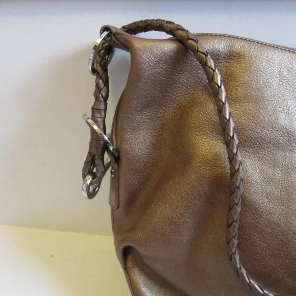 Etienne Aigner Bronze Copper Iridescent RETRO Hobo Shoulder Bag. 13"L x 2"W x 11.5"H. Braided 1/2" wide strap, 14" drop. Silver hardware and signature logo charm. All measurements are approximate. Good condition. Please see photos for more details. 0801s