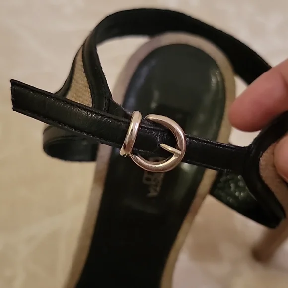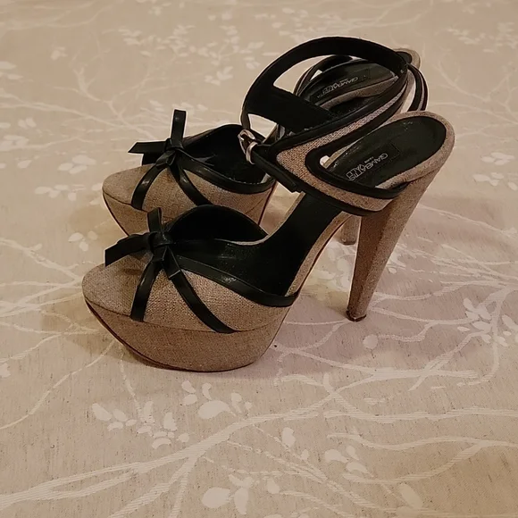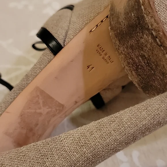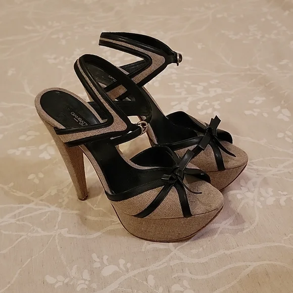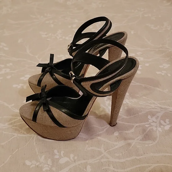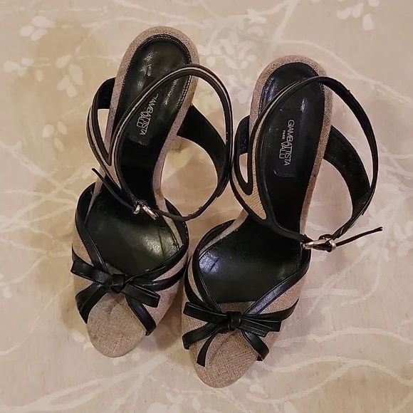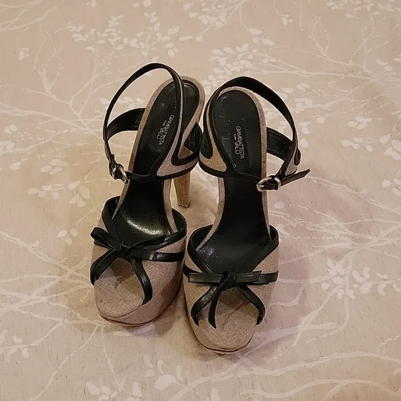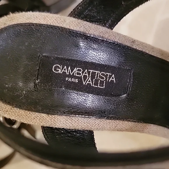 EUC GIAMBATTISTA VALLI Grayish Beige Linen & Black Leather Bows Platform SandalsSize: 41 (US 10)Grayish Beige Linen with Black Leather outlining the open toe bows & adjustable ankle closure. Linen covered platform (2") & (6") heels. Black leather padded insole & leather outsole & plastic cap on heels.Shoes are in excellent used condition, barely any signs of wear on shoes. Soles look dirty because of the dark scuffing against the light leather, but are really in very good condition.*Note: there is a small light brown spot on the insole, up by the toe on the right shoe. see pic*Retail $585
