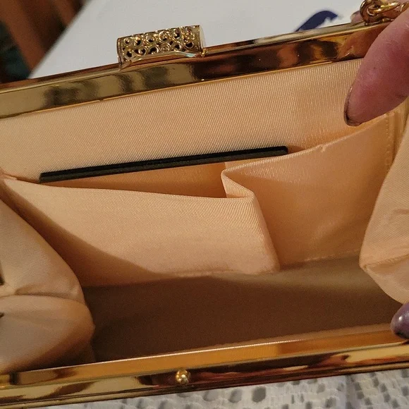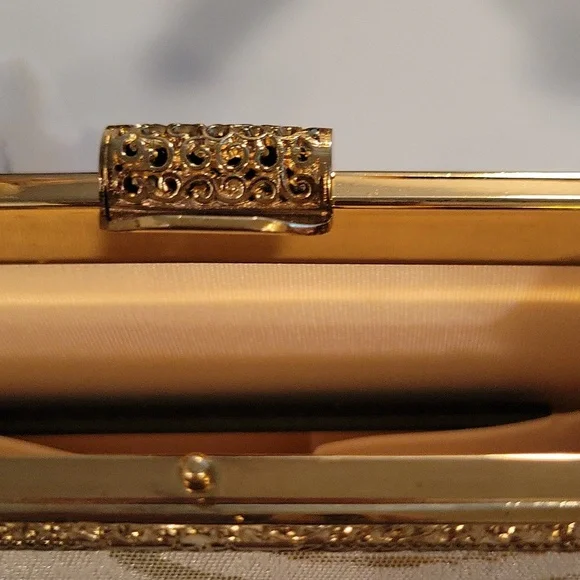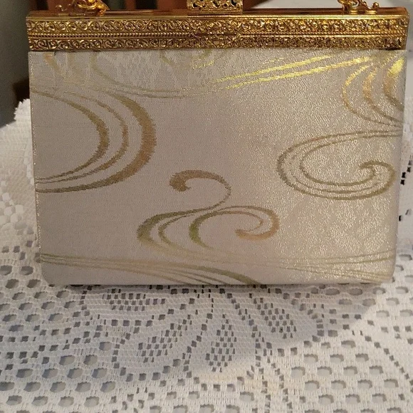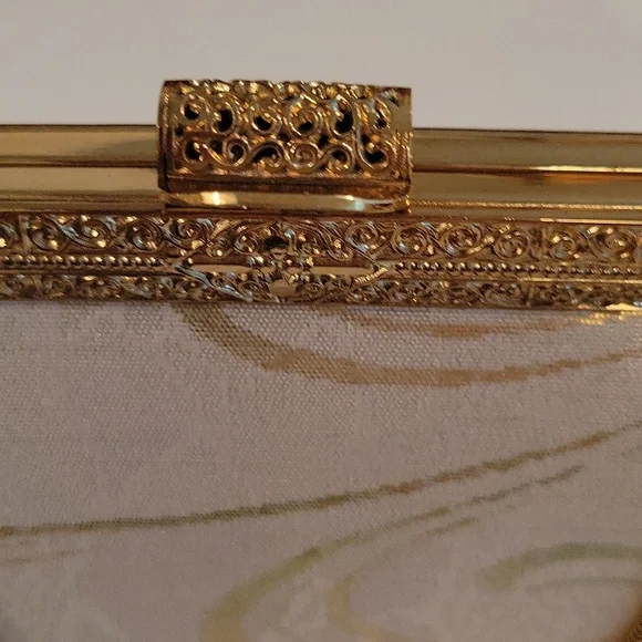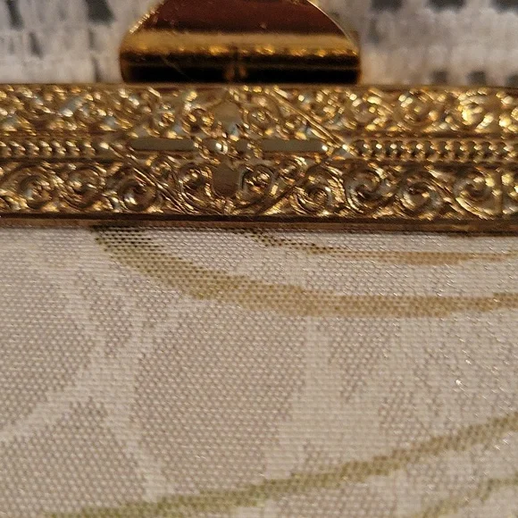 gorgeous shimmery fabric with gold glitter swirl design ~top metal of purse closure is very ornate floral filigree design gold tone metal, with rose gold snake chain handle`~ snap...