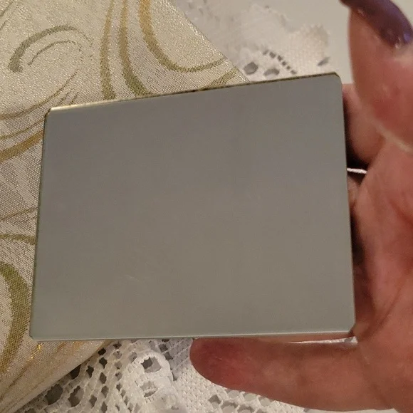 gorgeous shimmery fabric with gold glitter swirl design ~top metal of purse closure is very ornate floral filigree design gold tone metal, with rose gold snake chain handle`~ snap closure` estate sale find~beautiful mirror enclosed ~inside has both side pockets