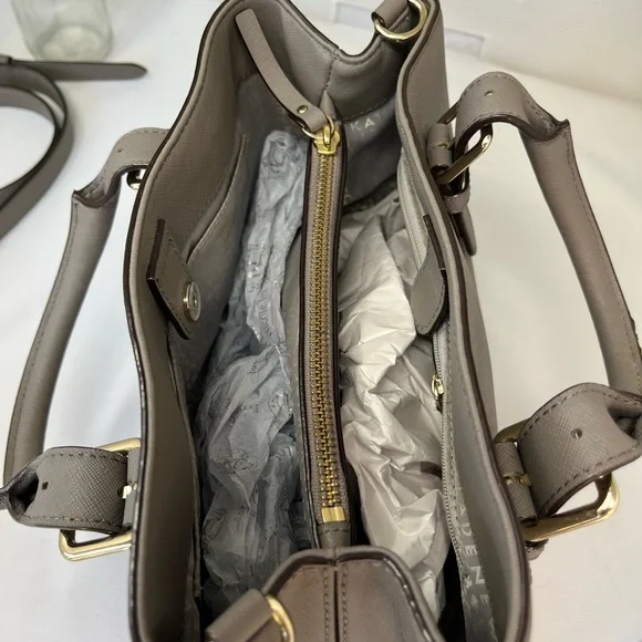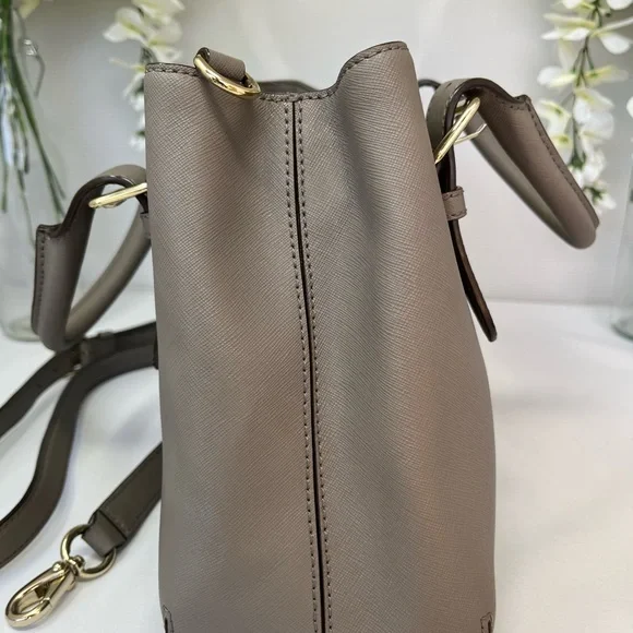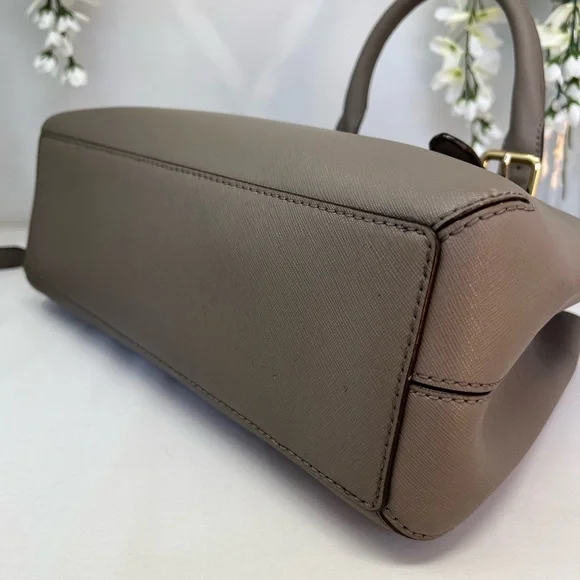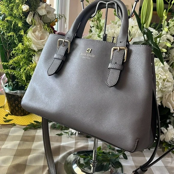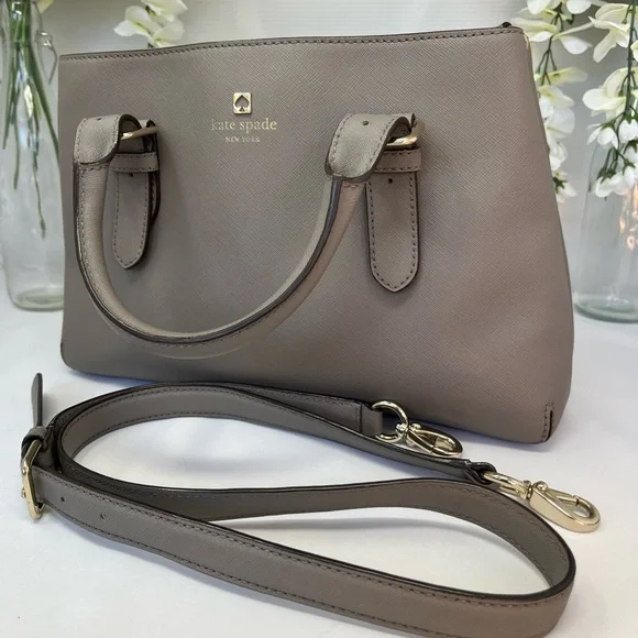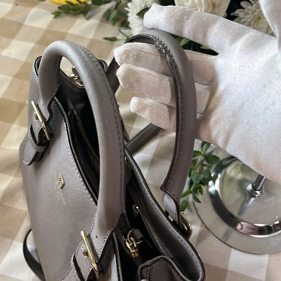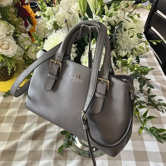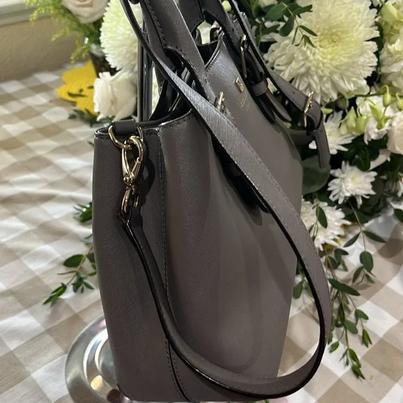 This sophisticated Kate Spade satchel in gray features a structured design with gold-tone hardware, offering a timeless and versatile look. Its medium to large size and detachable shoulder strap make it perfect for both business and casual settings.