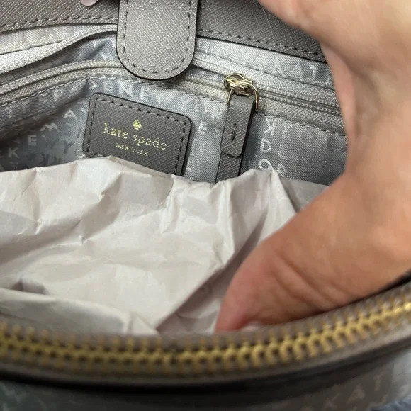 This sophisticated Kate Spade satchel in gray features a structured design with gold-tone hardware, offering a timeless and versatile look. Its medium to large size and detachable...